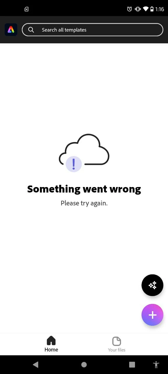 Hello. Over the last few days, when I try to open Adobe Express in my mobile phone (Android) I'm getting the error "Something went wrong. Please try again". The Internet connection is active fyi, and I don't try to switch wifi or anything like that.