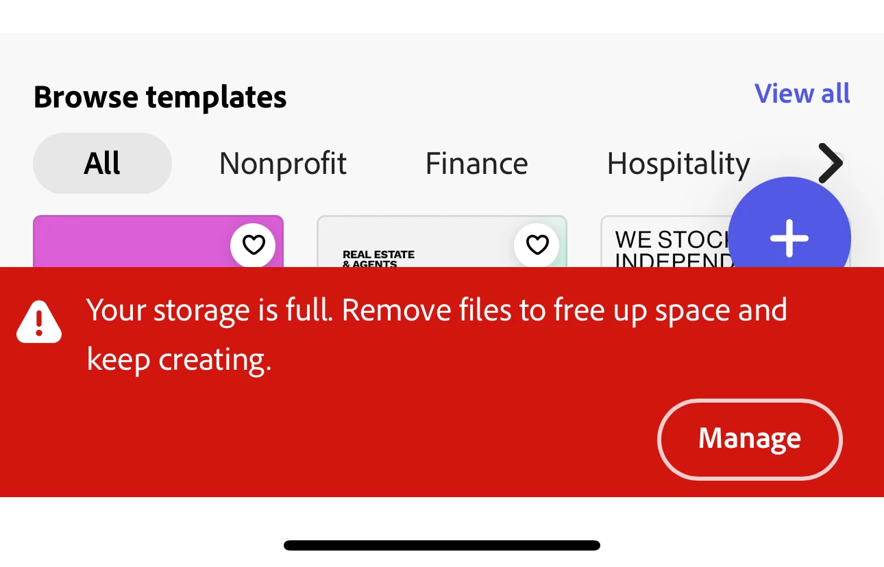 I am getting the above message everytime I open Adobe express I've deleted multiple projects from the app and the cloud and still unable to create a new project as my storage is apparently full?