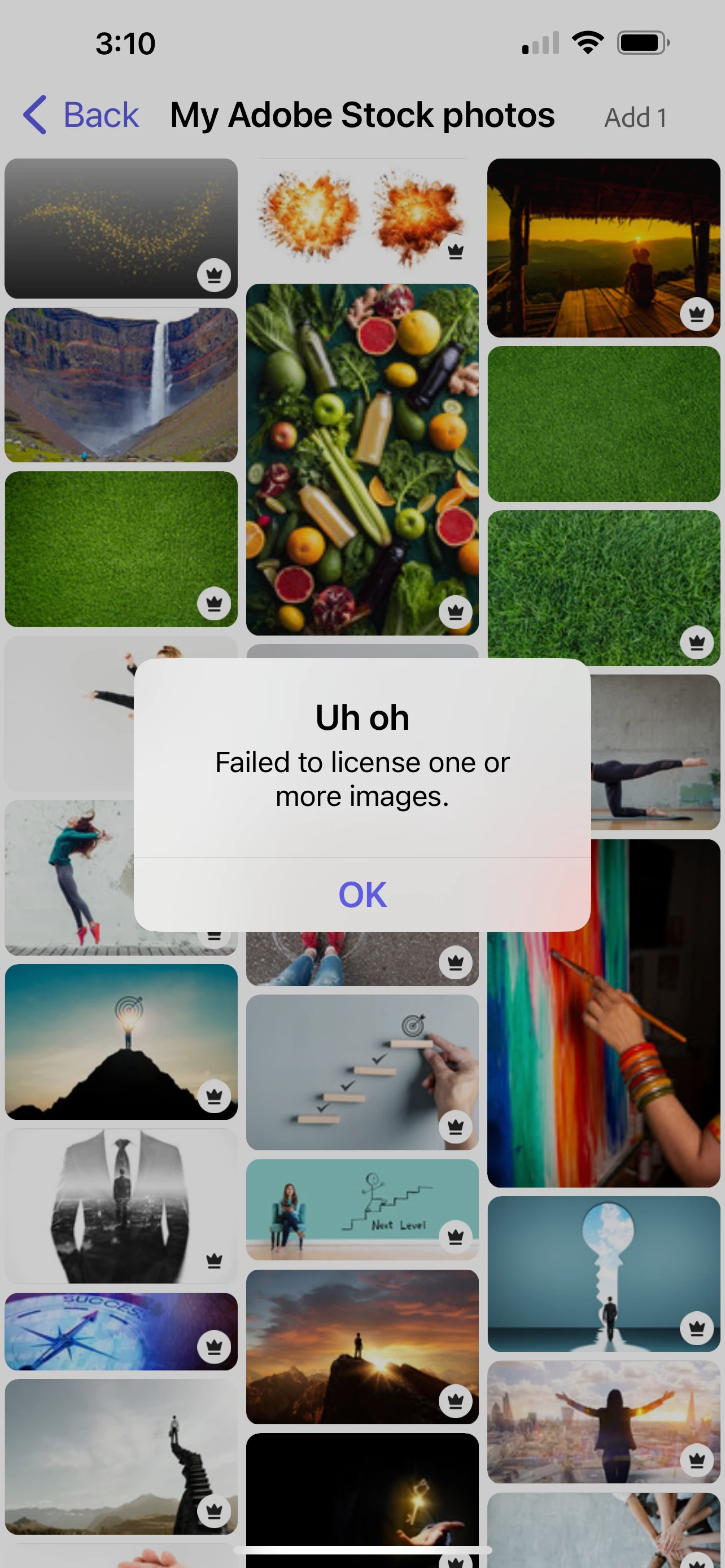 The error message is "Failed to license one or more images."