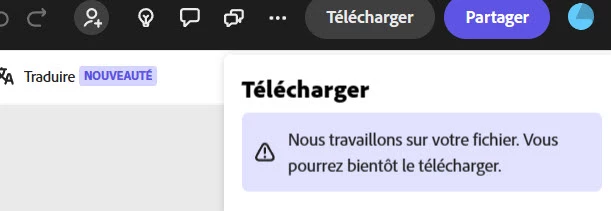 C'est le rendu final. Toutes les vidéos sont chargées, le projet est terminé, mais je ne peux pas l'exporter ou partager le fichier car Adobe express indique "Nous travaillons sur votre fichier- Vous pourrez bientôt le télécharger", mais impossible depuis deux jours, même en utilisant plusieurs serveur, en nettyoant les caches et en ayant fait toutes les mises à jour.