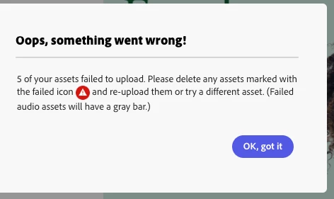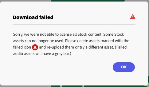 I've created several social posts using templates in Express, but I'm unable to download them due to these errors. I either get the error that stock assets are no longer licensed (but it won't tell me which ones), or that assets failed to upload - I didn't even upload assets this is purely from a template that I was testing before wasting my time customizing it only to find I can't download the images. These are both from templates I used from Adobe Express. I'm a premium member with unlimited stock downloads.