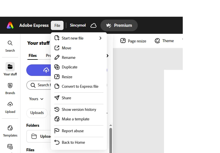 It looks like you're viewing the File menu from the "Your Stuff" section in Adobe Express, and that’s why the Download option is not appearing. This menu is for file management (renaming, moving, converting, etc.), but Download is only available when you're actively editing a project.