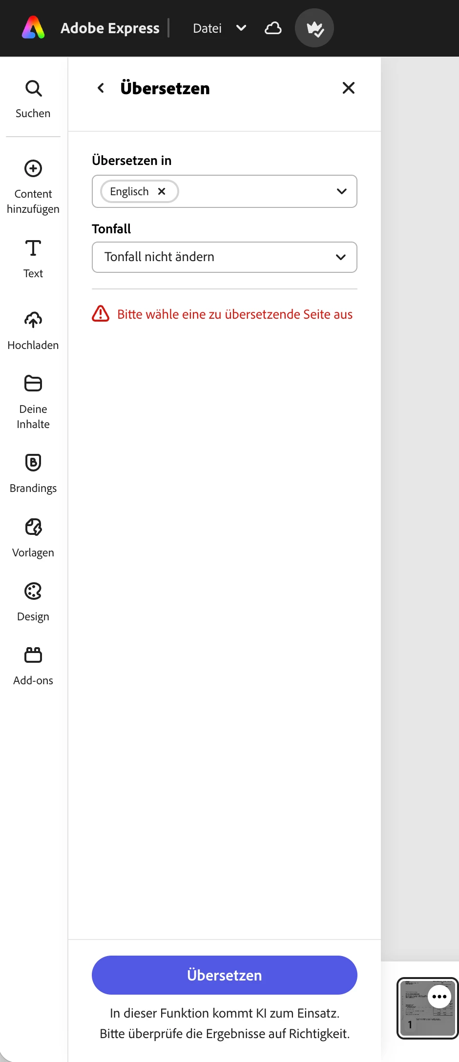Every time i select a page and click translate and select "English" and "Don't change tone" it says "Please select a page to translate" even tho it's already selected. This seems like a bug I tried it in Safari and Chrome