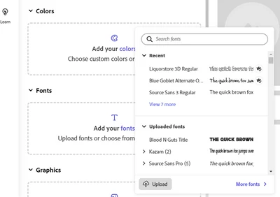 There's no button for me to upload fonts onto Adobe Express. Have tried both from the Brand page and the Add Text dropdown menu.
