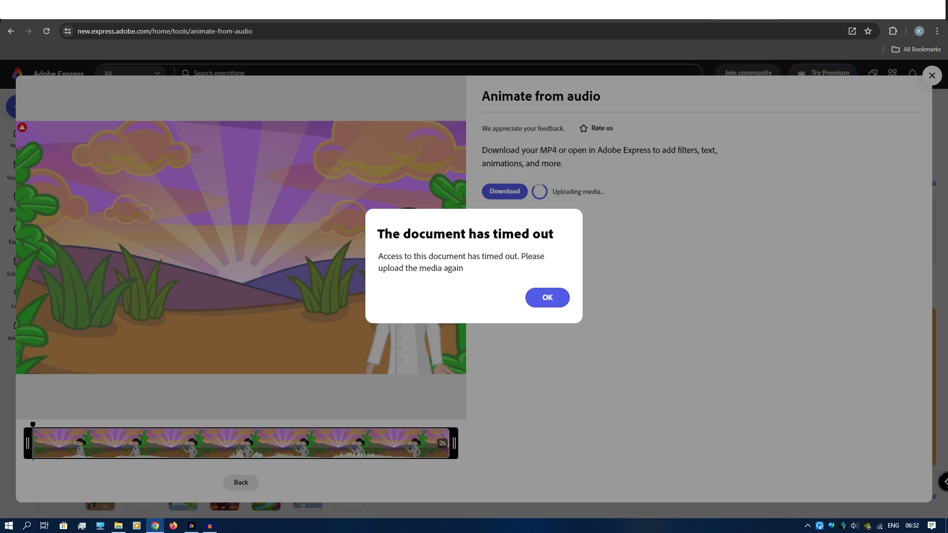 Ddefault37756153h4re0nParticipantForum|Forum|1 year agoMay 31, 2024unable to download from "animate from audio"Forum|Forum|1 year agoMay 31, 20241 reply103 viewswhenever i create a character with audio, i cannot download the created character, it always display a dialog box that says Access to this document has timed out, please upload the media againQuick ActionsDesktop Web
