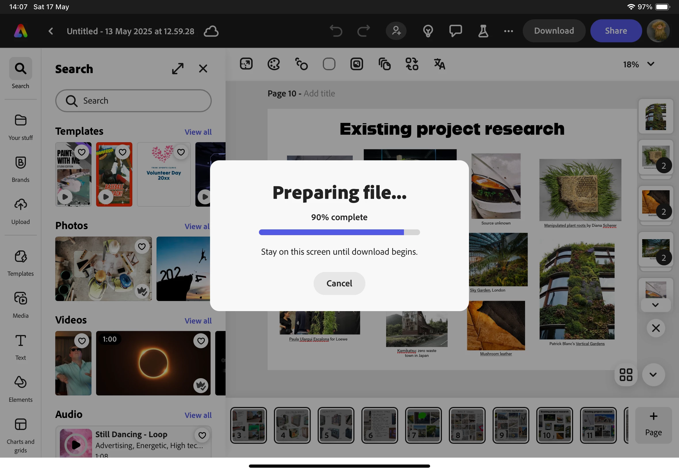 For a while now I've been having trouble with downloading larger files as PDF. When I try to download the file, the progress bar gets stuck at 90% for preparing the file (see attachment). I stay on the screen and I've tried waiting multiple hours, but nothing happened. I usually use Adobe Express on my iPad Air 5, but I've tried exporting my project on my Windows PC as well, on which I had the same issue (again I waited multiple hours and the progress bar was stuck at 90%). The issue occurs with both standard PDF and printing PDF.