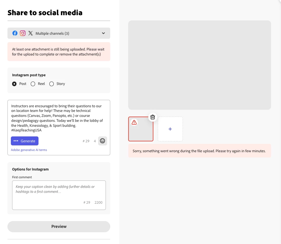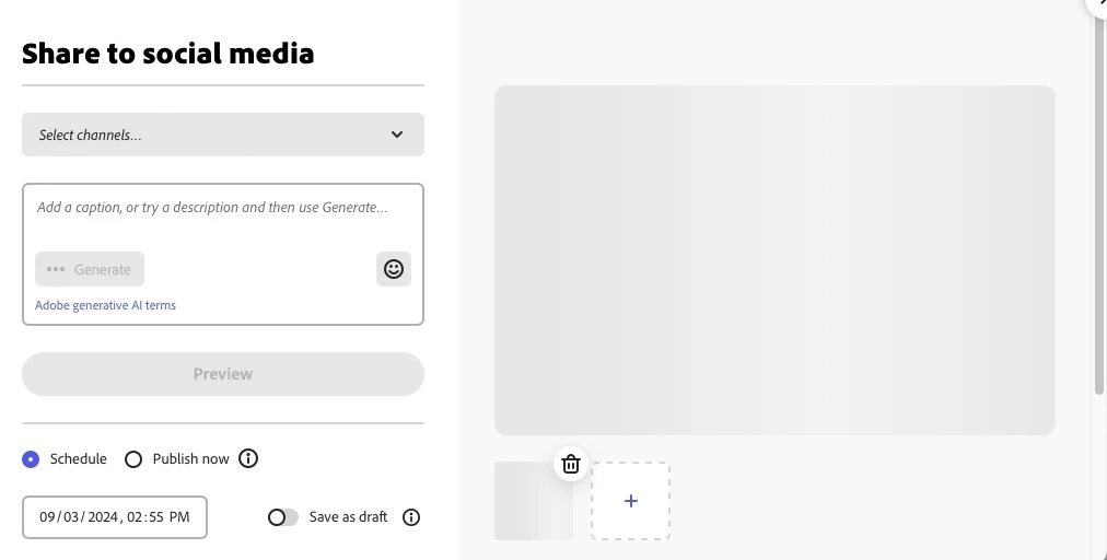 Same here, I am unable to successfully add adobe express creations (instagram square, and flyer size designs) to my schedule. I tried sharing my png directly from the Adobe Express page where I created the post, using the share button and schedule post button. The Schedule Share Post window never loads the creation, and I can't preview anything I try to share.
