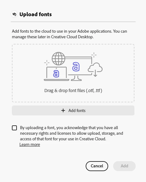 I use Adobe Express via my Creative Cloud subscription. In the Brand Library, I see the option to add a custom font but whenever I click on it, it only opens the font list. When trying to drag and drop the fonts in, it only redownloads the font instead of uploading it. How can I add the fonts?