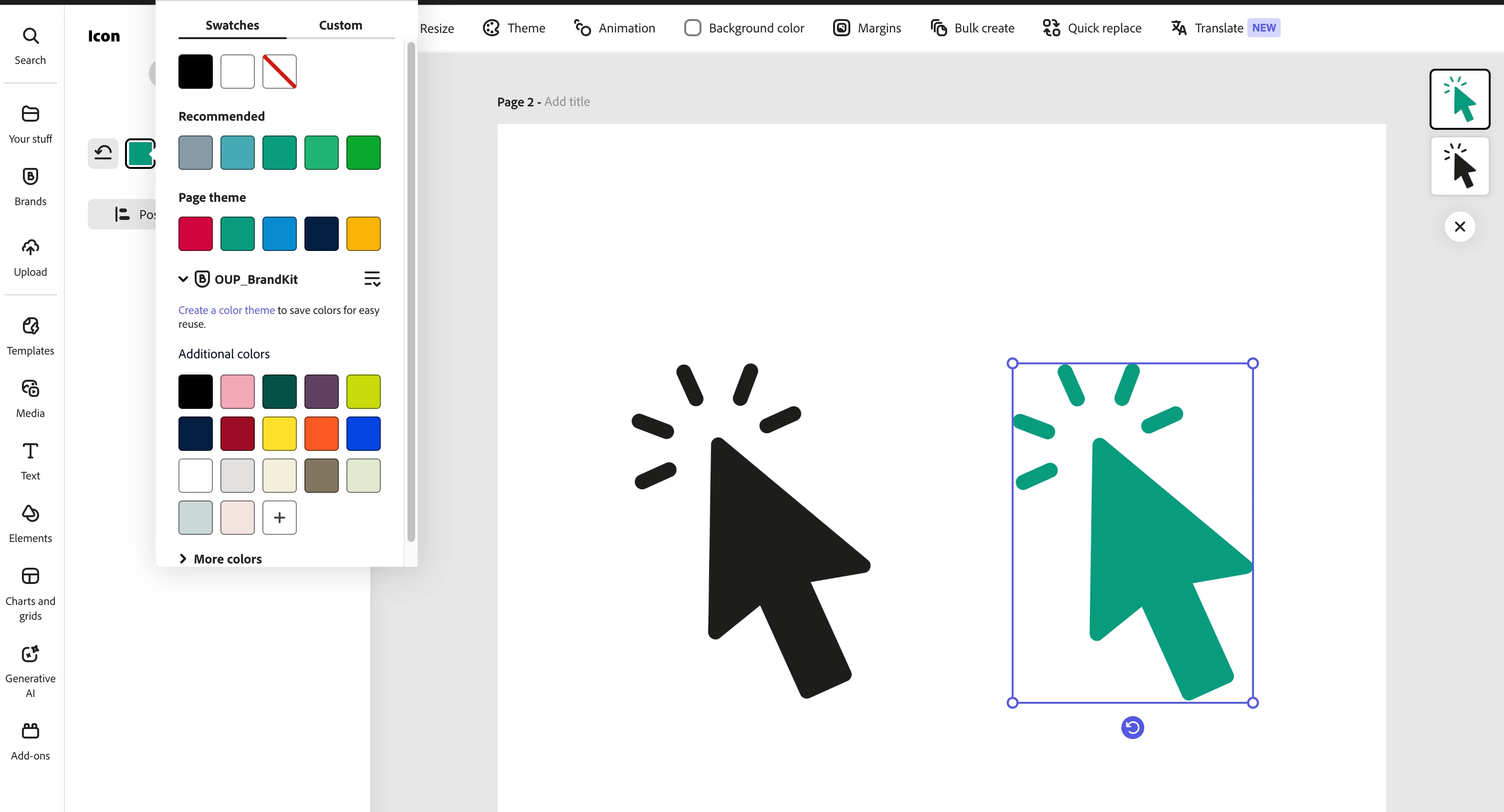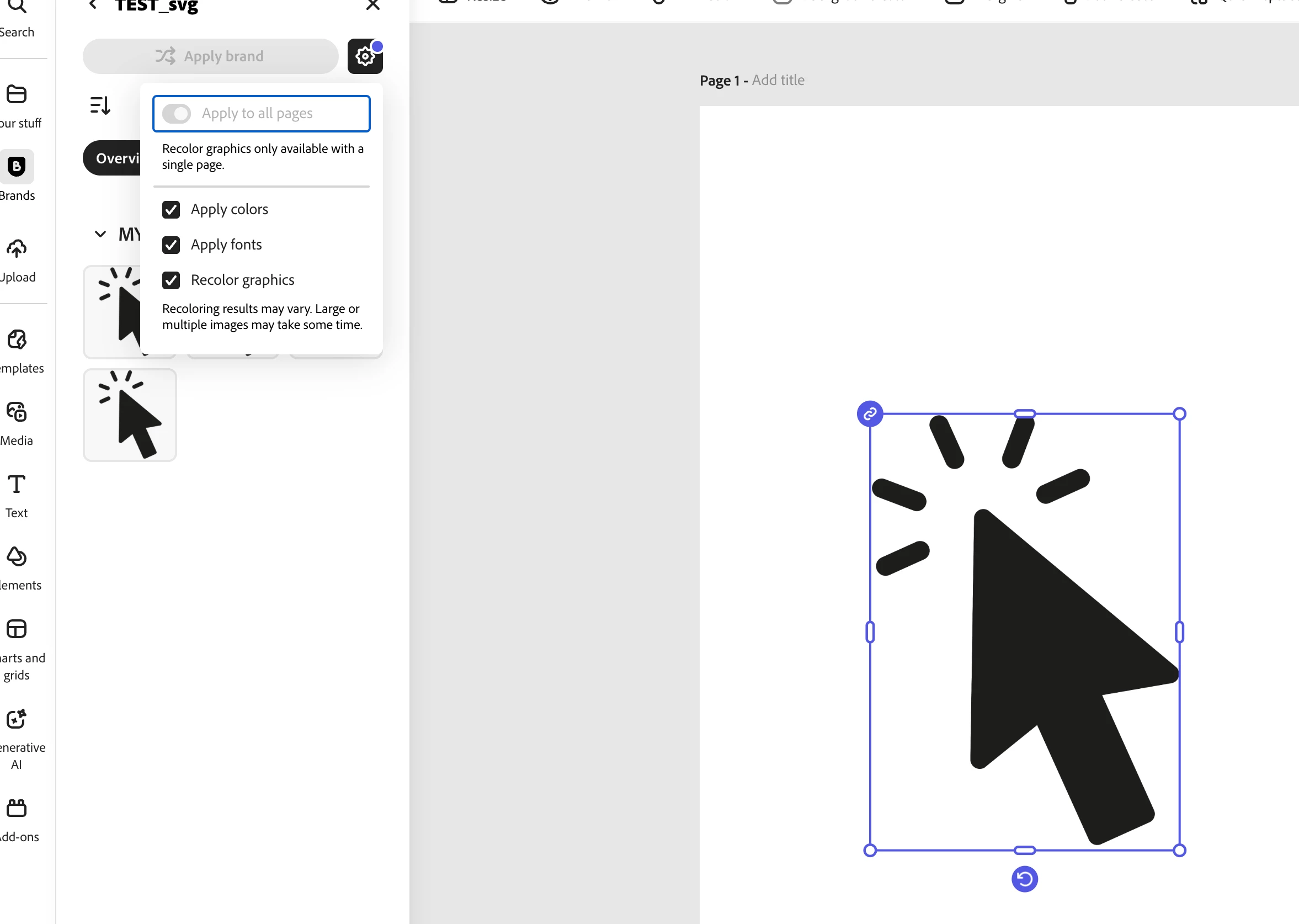 The product team has done a great job and has been able to share that Adobe Express now supports the ability to recolor SVG's. I have found that you can recolour an SVG if you upload media when working on an asset. If I upload an SVG icon to my brand kit you don't get the same function. Surely you should be able to recolour SVGs in brand kits if you can elsewhere? Or is it the way the file is uploaded to Adobe Express that I need to do differently? We have 50 icons that we want to upload for teams to be able to recolour.