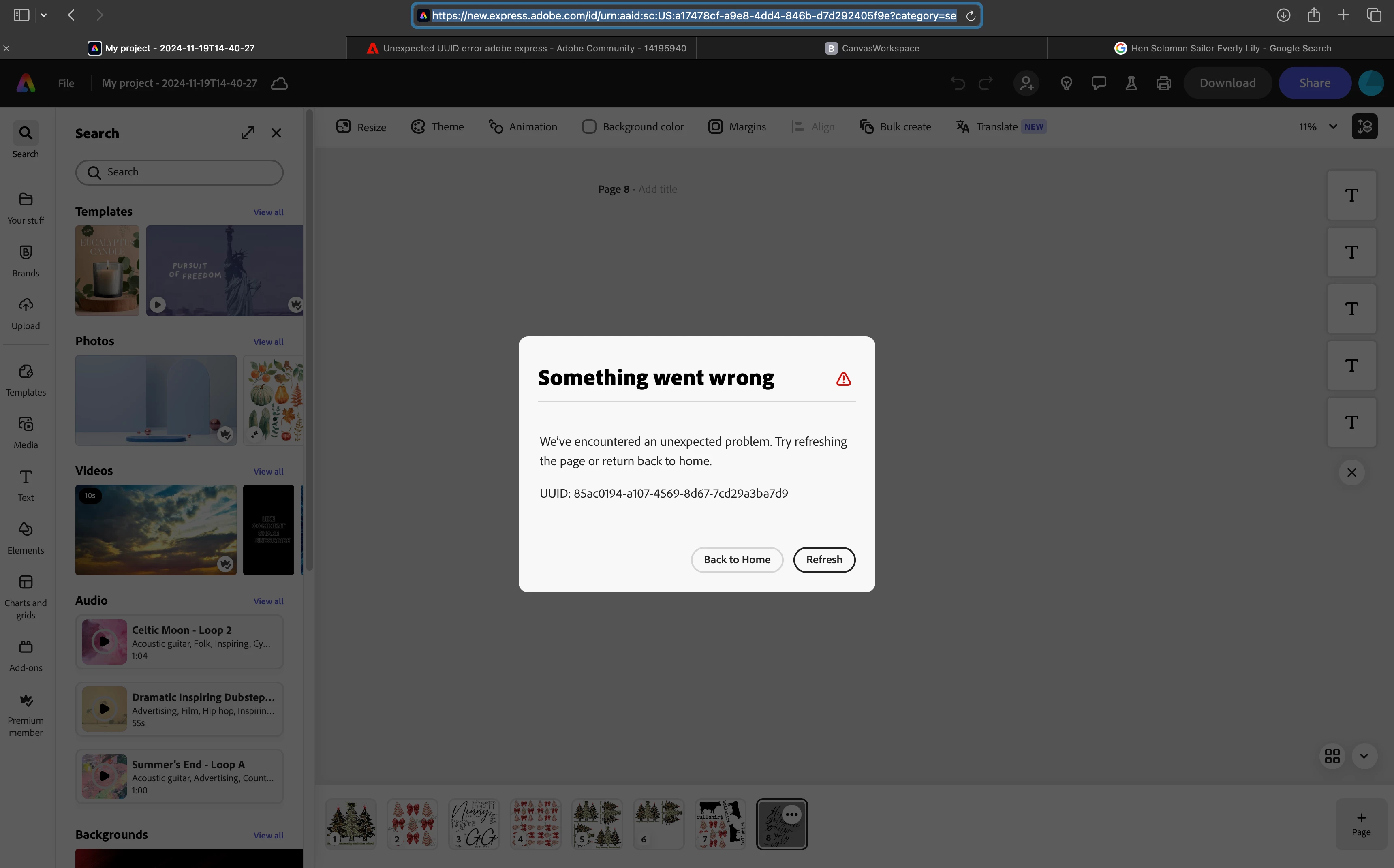 additional note: I'm using the browser version of adobe express; its a flyer sized project file with lots of images, links, text, etc.