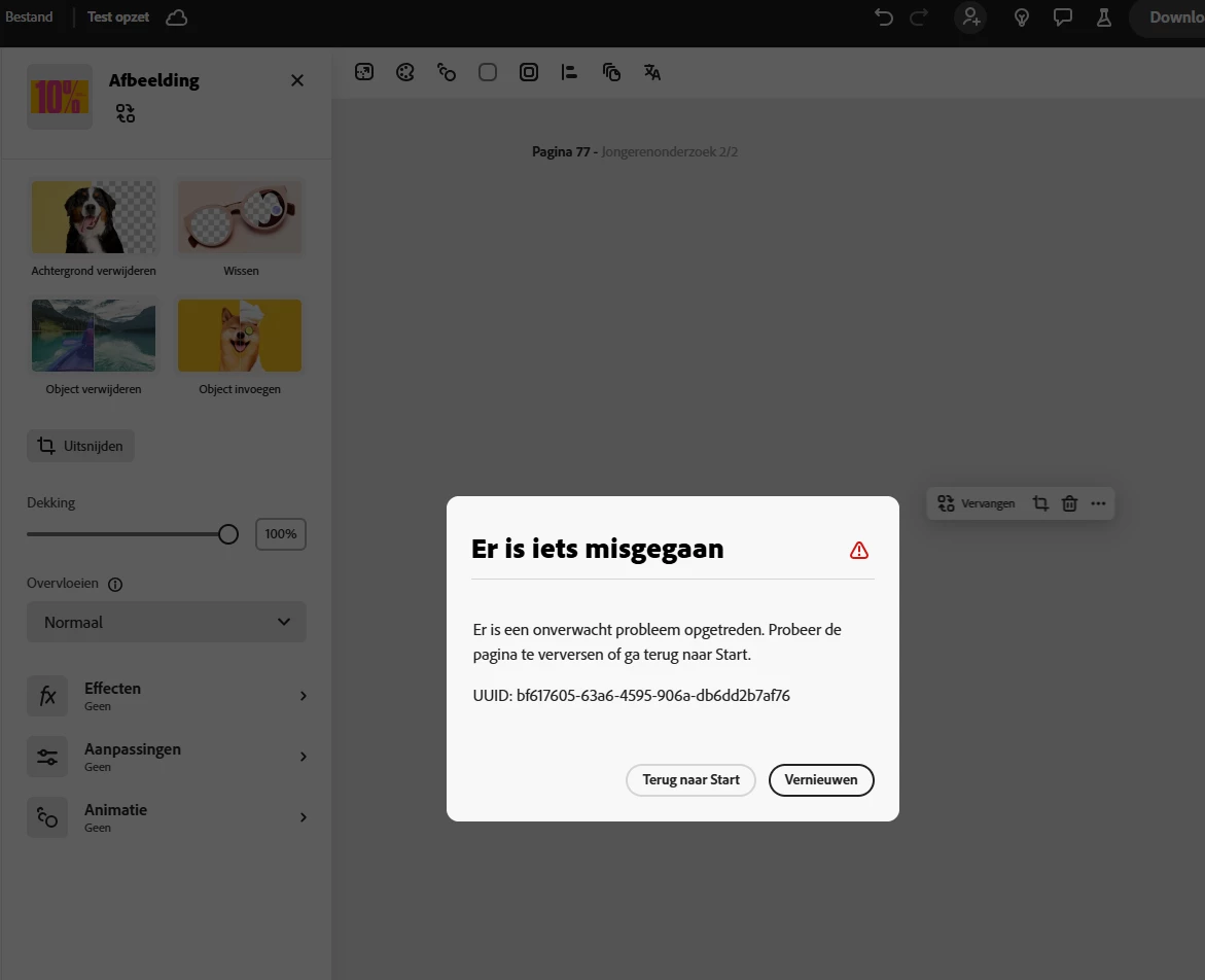 I'm receiving the same error message w/ a different error code: UUID: 0a85ea97-7eb7-4ae6-a753-ce5b39cd27e5.  It started when i was using the generative image tool and it choked ("window not responding").  I had a new file open using the generative image tool.  However, now my large project files (97 pages and ~ 100 hi res images) get the above error massage as soon as I go to the 'view all pages' view and all the image files load.   I've rebooted, logged out, cleared my cache, but no luck.  My smaller project files (8 pages, ~ 4 hi res images) do not seem to have the same issue.  Any suggestions?