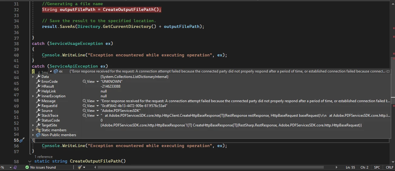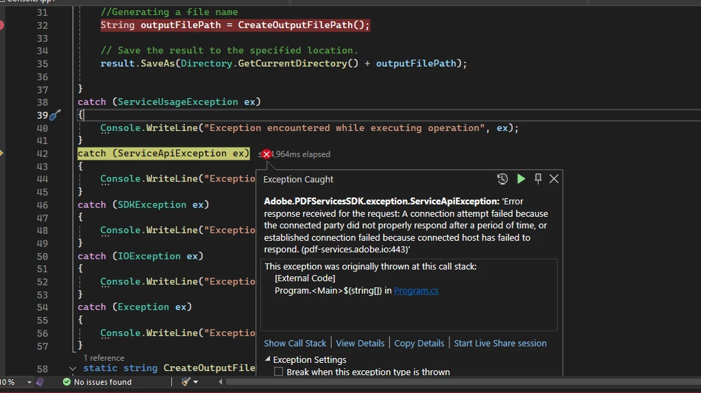 Adobe.PDFServicesSDK.exception.ServiceApiException: 'Error response received for the request: A connection attempt failed because the connected party did not properly respond after a period of time, or established connection failed because connected host has failed to respond. (pdf-services.adobe.io:443)'