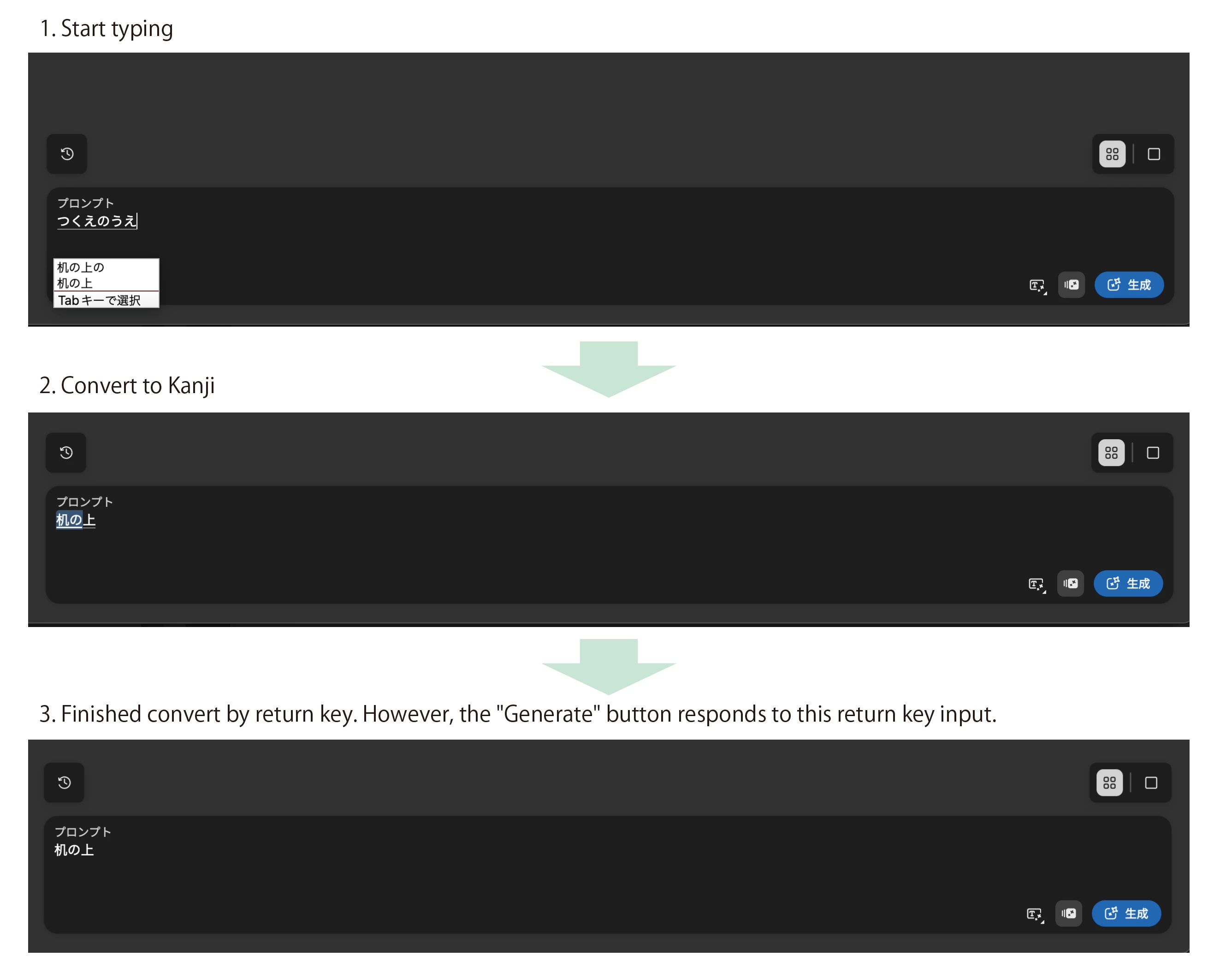 日本語を入力する際、一度文章を確定するためにエンターキーを押しますが、それがすぐに「生成するボタン」にて反応してしまいます。