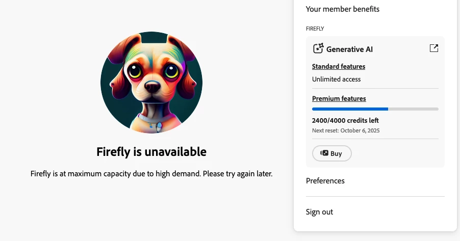 so i got a message that said "something went wrong, try back later" and "Firefly is at maximum capacity due to high demand. Please try again later." without producing any video i requested but my credits went down fast!!!! from each click...