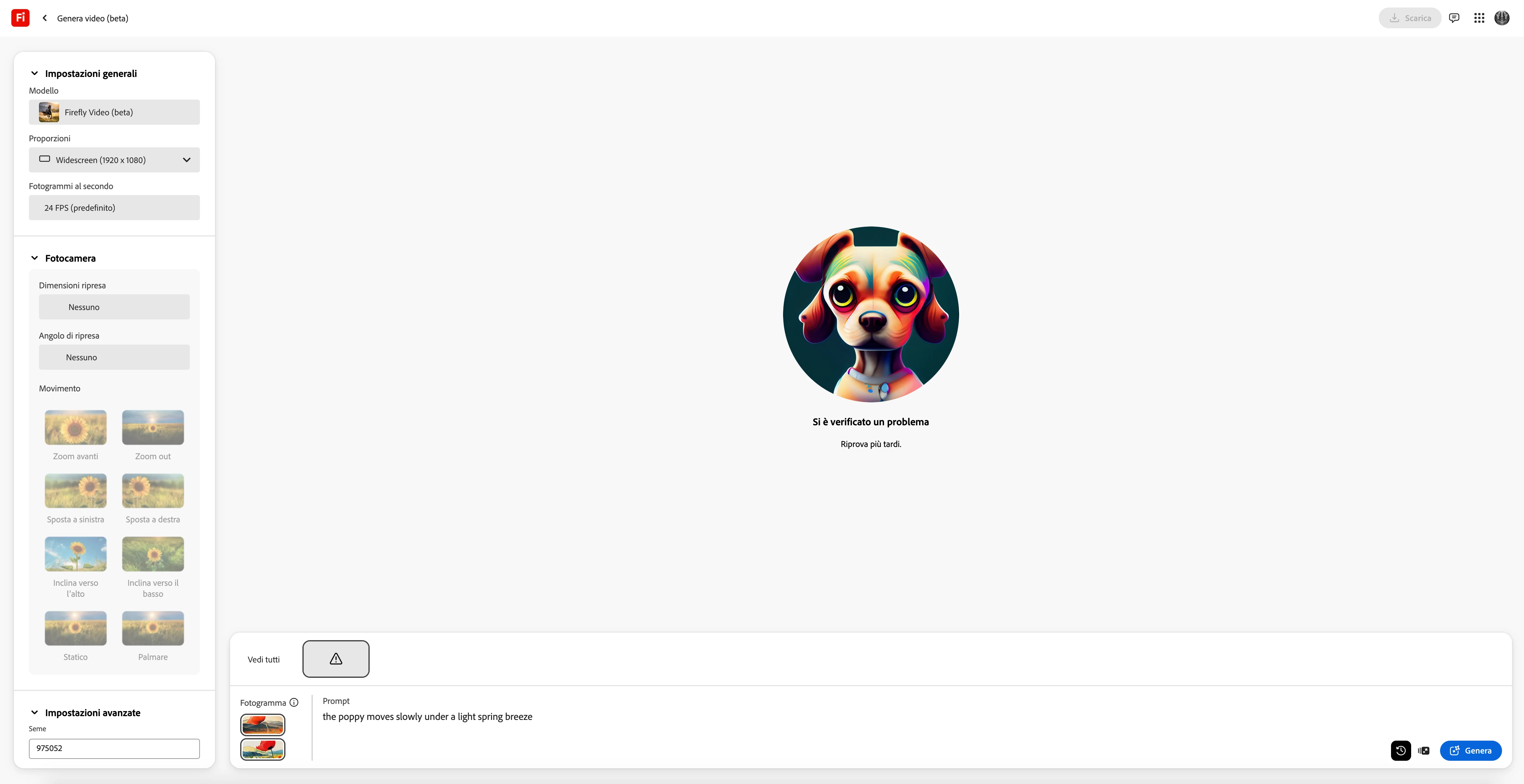 I would like to point out that since last week, when I try to generate a video from an image with Adobe Firefly, I get the message "A problem occurred, please try again later" (in Italian, "Si è verificato un problema, riprova più tardi"). I am using Adobe Firefly via Firefox, version 136.0 (64 bit). Could you please fix this or if there is any problem with my account could you please let me know what is wrong? Thanks!