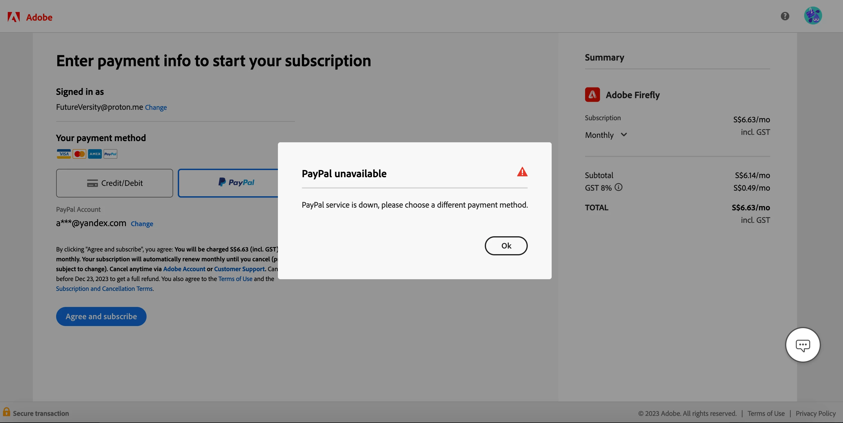 Adobe Firefly subscribtion payment: PayPal is down