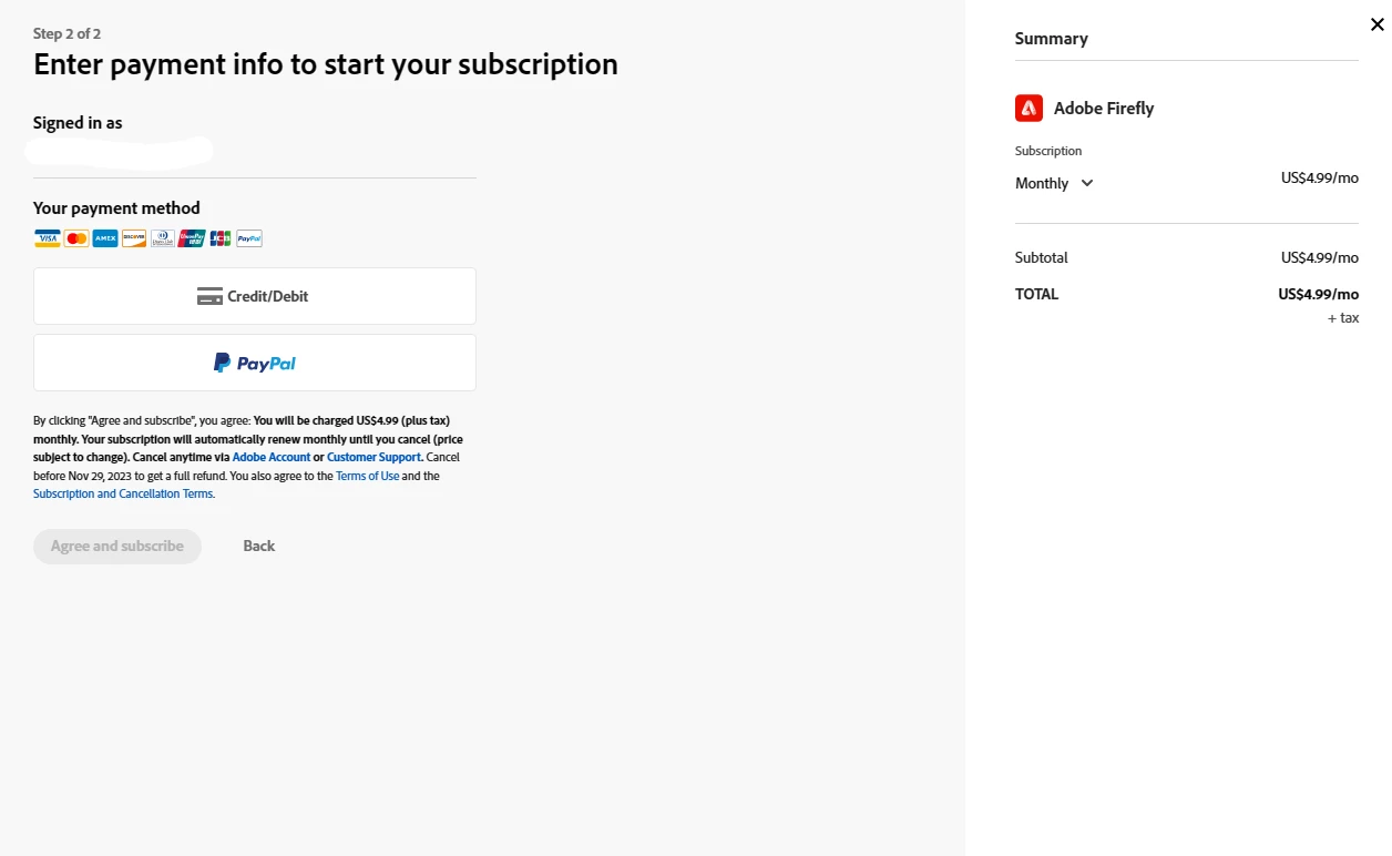 Hello, I just tried to subscribe to the Adobe FireFly $4.99 subscription. But, after confirming with PayPal, it shows it's processing then just goes back to Adobe FireFly. I've tried it twice and I don't see that I've been charged or that I have an active paid account.