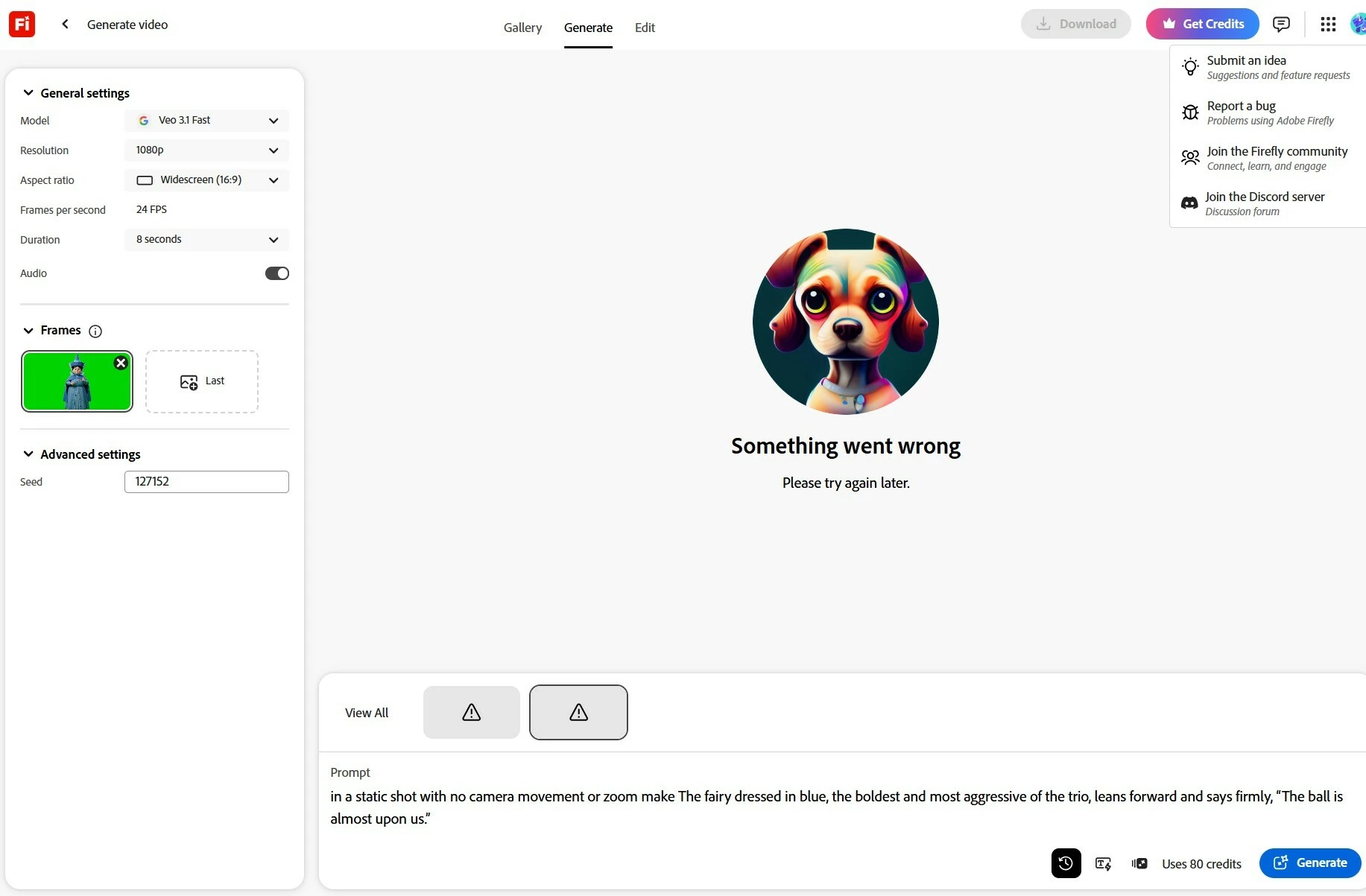 All day, and yes, I mean ALL DAY. The same error reporting generation failure. This is discusting that I am being charge my hard earned money for a service that dose not work at all. Multiple diferent first frame references in combination with multiplu veriations of text prompts generated ZERO footage at all.