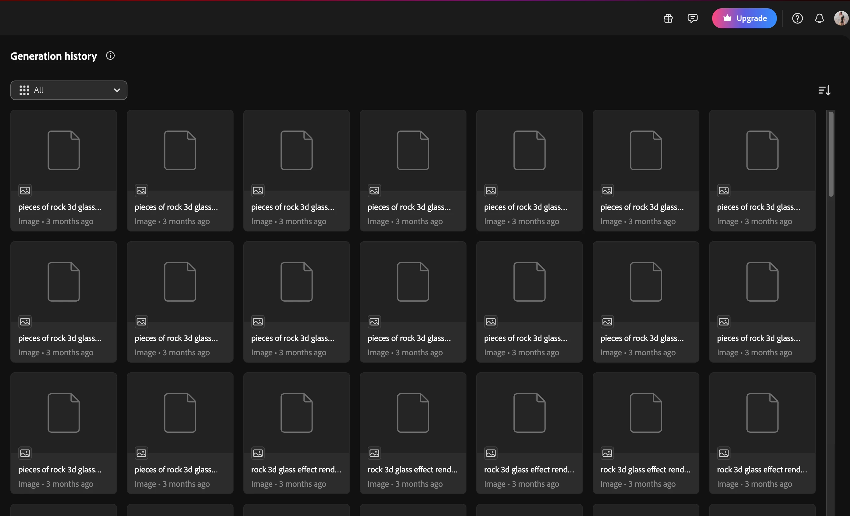 I’m experiencing an issue with my Adobe Firefly generation history. When I open the history panel, I can see the cards of my previously generated images, but the cards appear empty. When I click on any of them, an error message appears stating that the generated images cannot be displayed.