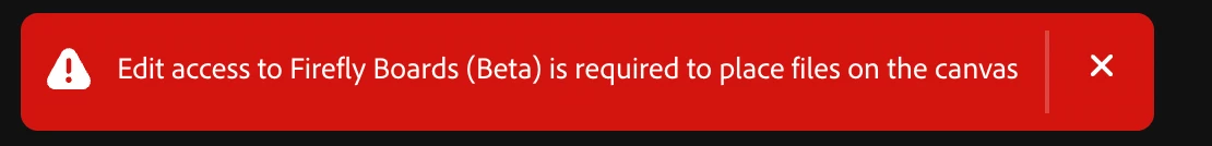 Just tried to use the new Firefly Boards feature but it doesn't seem to be working at all. Clicking on "Create new board" or "Remix file" under the featured projects loads a page which shows an error saying "Error cloning document". If I then try to drag an image into the browser I get another error saying "Edit access to Firefly Boards (Beta) is required to place files on the canvas".