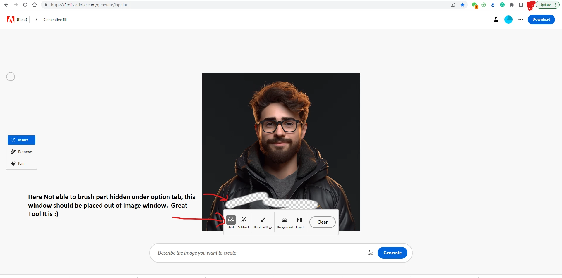 VVikram31244096n814ParticipantForum|Forum|2 years agoJuly 23, 2023Brushing area issueForum|Forum|2 years agoJuly 23, 20231 reply253 views above image, can see i am not able to brush the area hidden under menu options whose position is freezed It should be somewhere where brushing not required Thanks email ID : vilram.bhosale407@gmail.comFirefly GeneralGenerative Fill