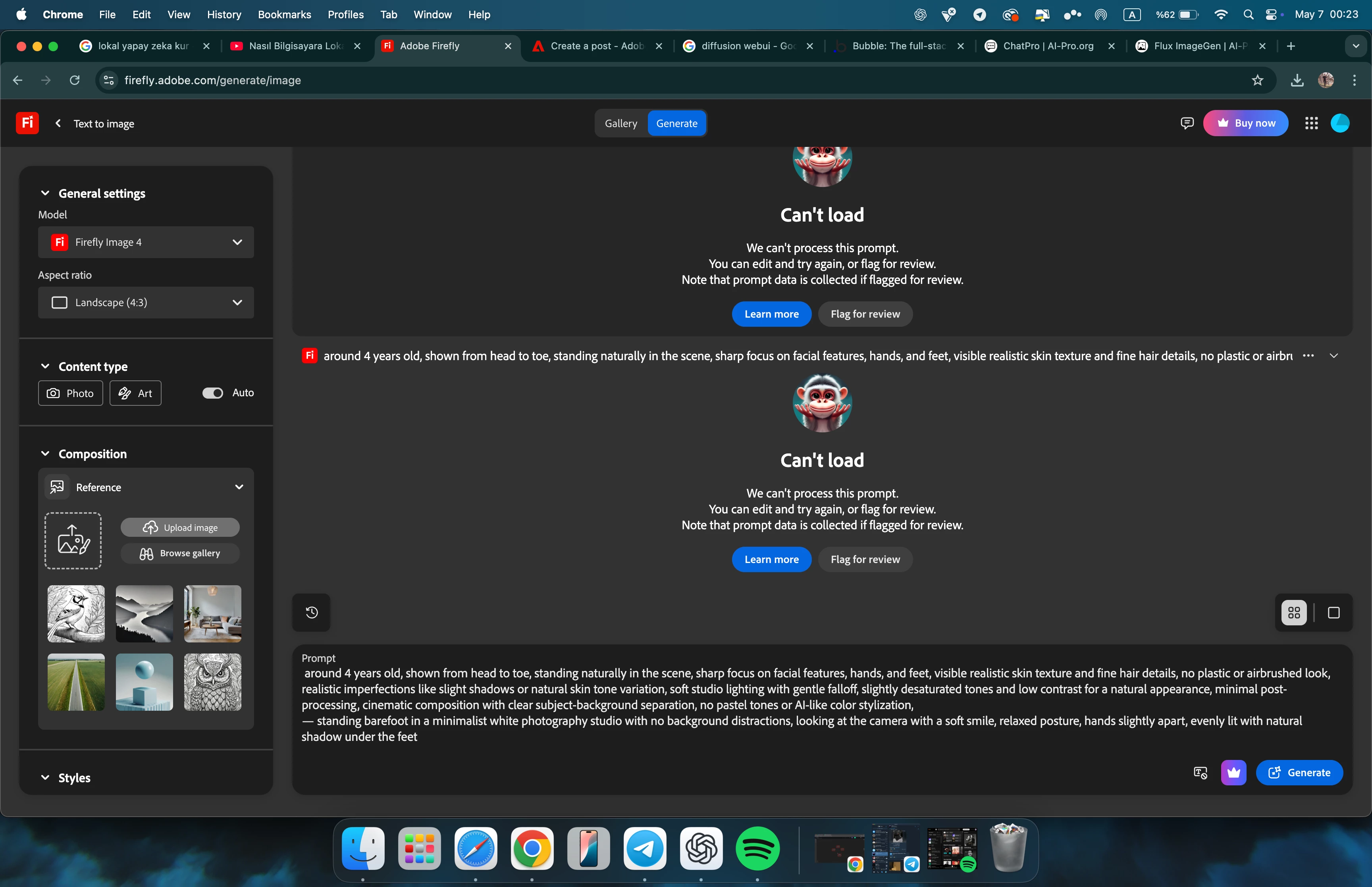I'm a children's clothing designer and I use Adobe Firefly to create character illustrations to showcase our outfit designs. However, whenever I try to generate a character that looks like a child (around 4–13 years old), I get the following error: "We can't process this prompt."
