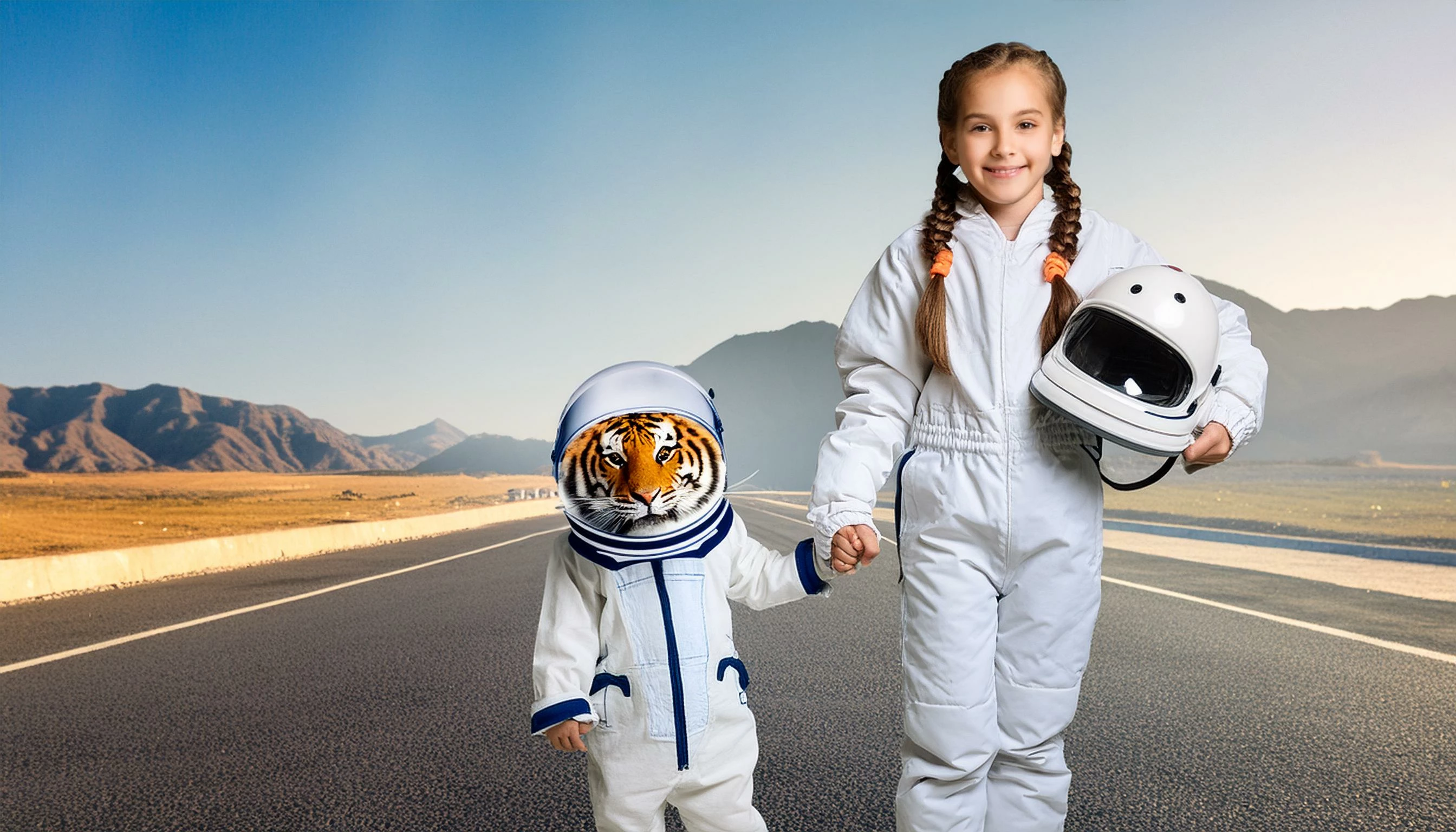 promt: A caucasian astronaut girl holding hands with a small tiger astronaut