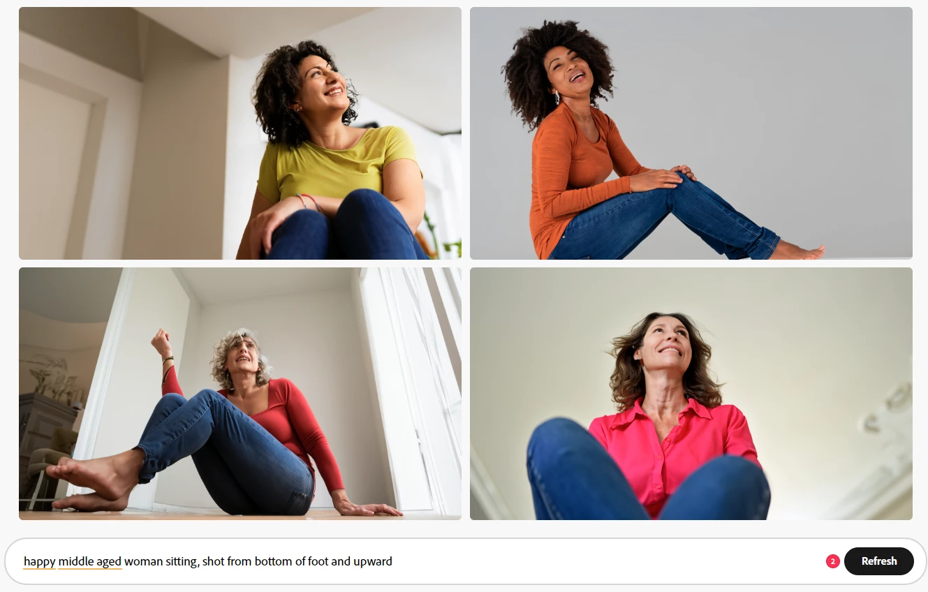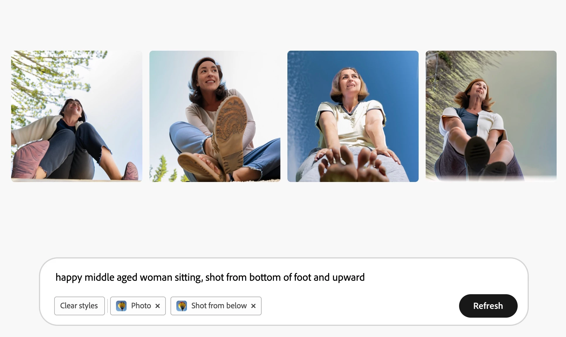 3. Several variations of the following prompt "happy middle aged woman sitting, shot from bottom of foot and upward"; Content type: photo; Composition: shot from below; Aspect ratio: 1:1, 16:9