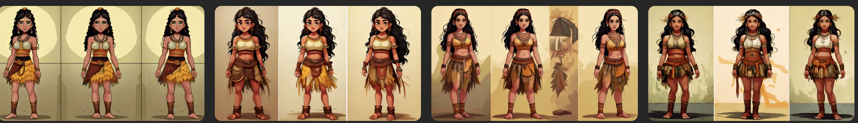 Cada quadrado, mostra um angulo dela, o primeiro quadrado mostra ela de frente, o segundo a 45º, o terceiro a 90º e o quarto a 135º, todos com a imagem dela em pé mostrando o corpo todo com fundo transparente.