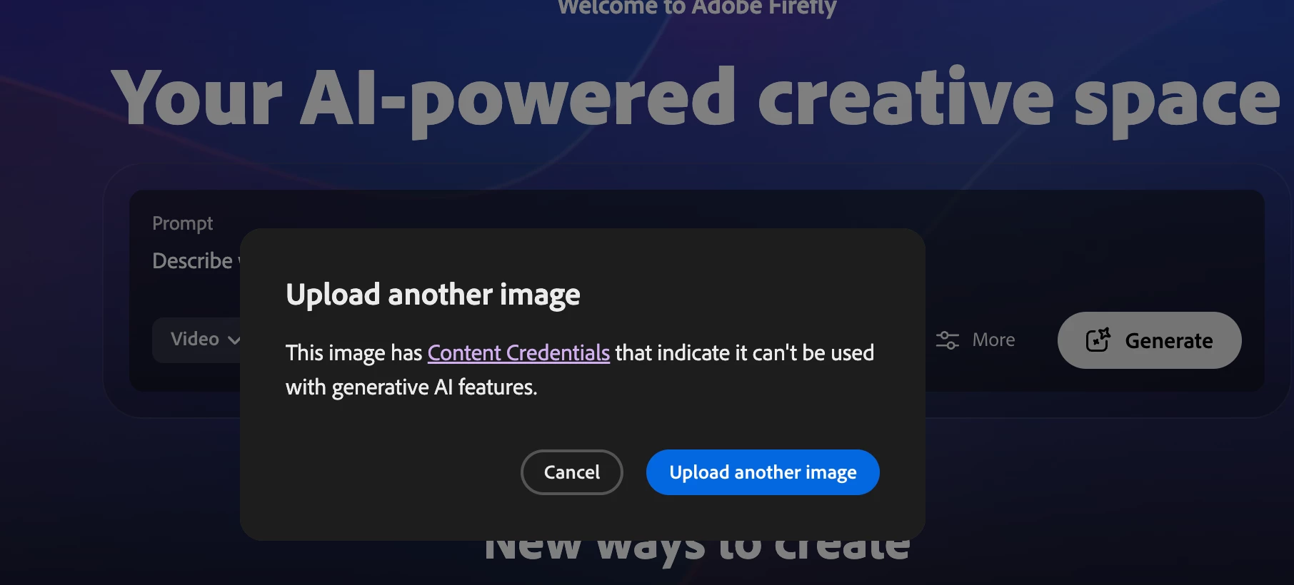 Every image I upload as the first frame for Firefly Video generation is flagged with the "content credentials" error. Even when I create a completely new, flat white .jpg.