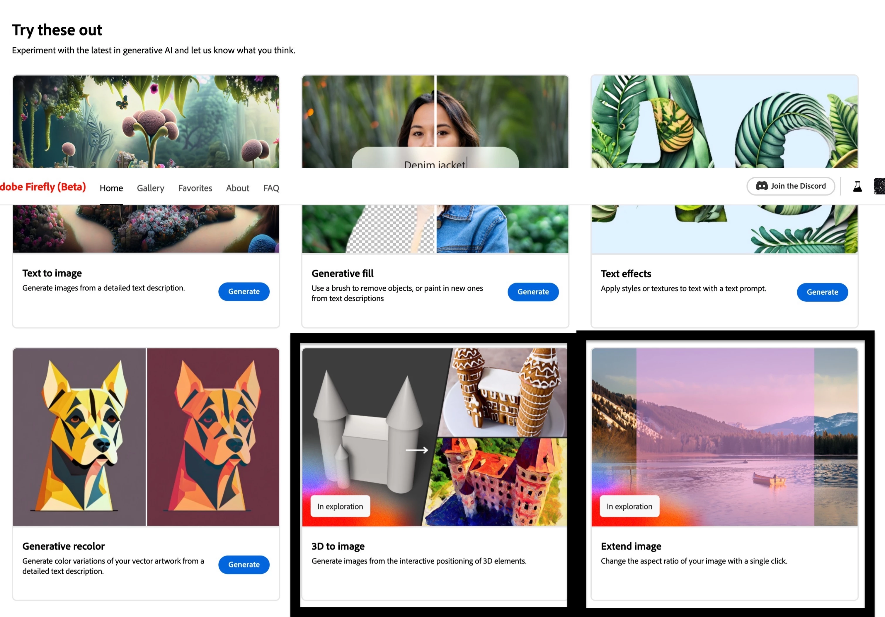 I have noticed for a while now that Extend Image and 3D to Image have been in the "Try these out" section, where only available, public production features that can be used are shown - but these two features have been and still are disabled and in the exploration state. Normally, they would be in the section dedicated to not yet available, WIP features, at the bottom of the page - which confuses me if it's just a bug and these features are actually publicly available and useable, or if it's, as it says, still in exploration and it's just a UI variable or flag incorrectly set making it appear in the wrong section.