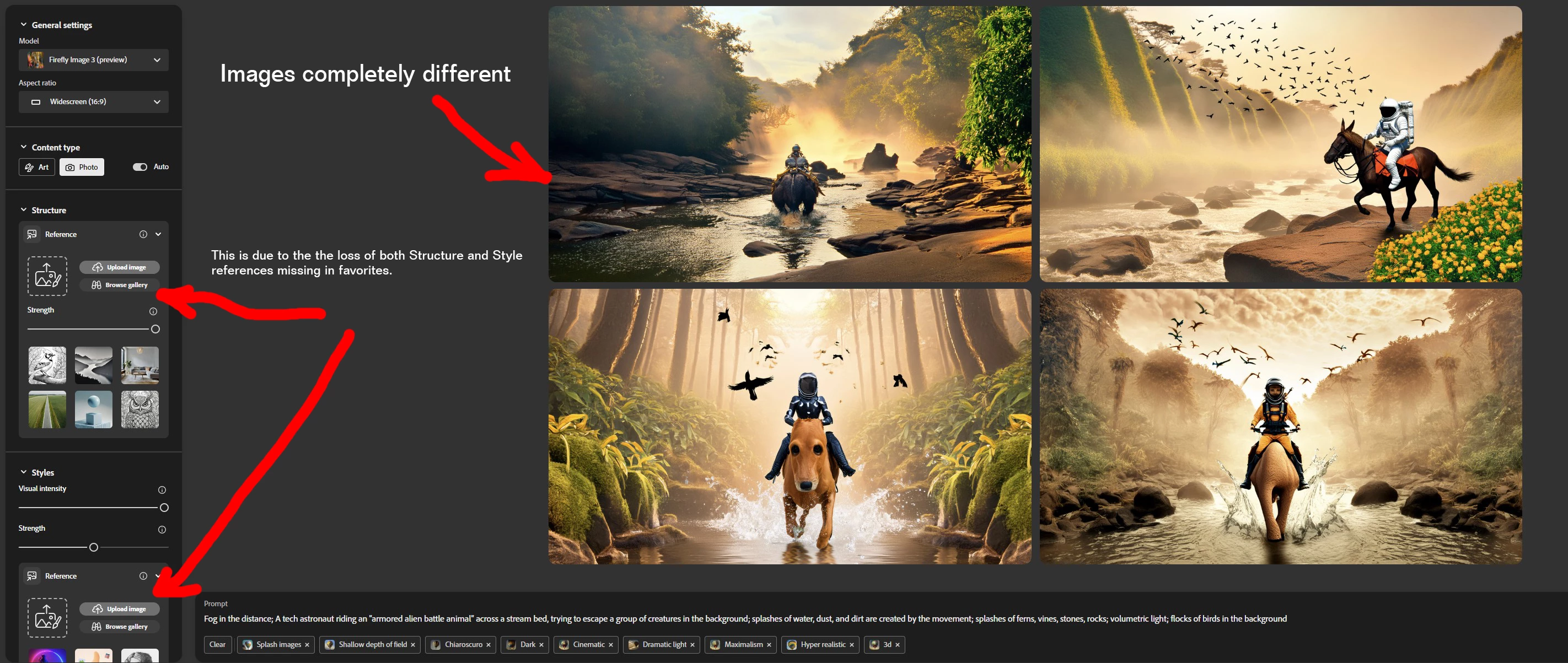This is what I get. The four samples are completely different due to the fact that the structure & style references are missing. There is about 85 images stored on the favorites page, they are all affected, except the 15 recent ones.