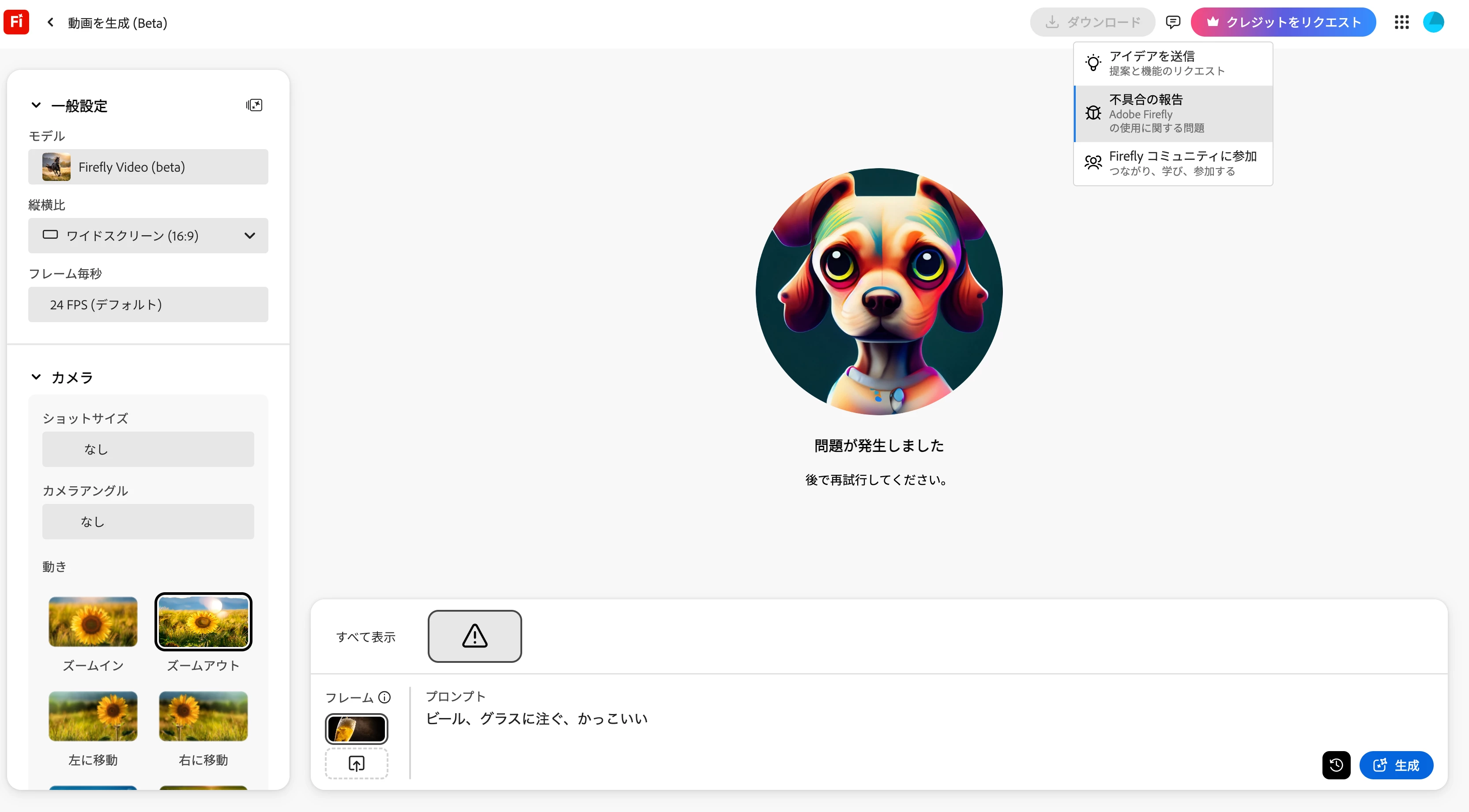 晋晋二31444772vzc6ParticipantForum|Forum|11 months agoFebruary 26, 2025FIREFLYが使用できないForum|Forum|11 months agoFebruary 26, 20251 reply262 viewsFIREFLYの「画像から動画を作成」を利用しようと生成ボタンを押すと必ず「問題が発生しました。後で再施行してください」という文字が表示されます。かれこれ1時間程、時間をおいて再思考をしても結果は変わりません。月々の生成クレジットはまだ残っています。どうすればいいでしょうか。 #FIREFLYMobileCommunicationsImagingDesignDesktopAudio and video