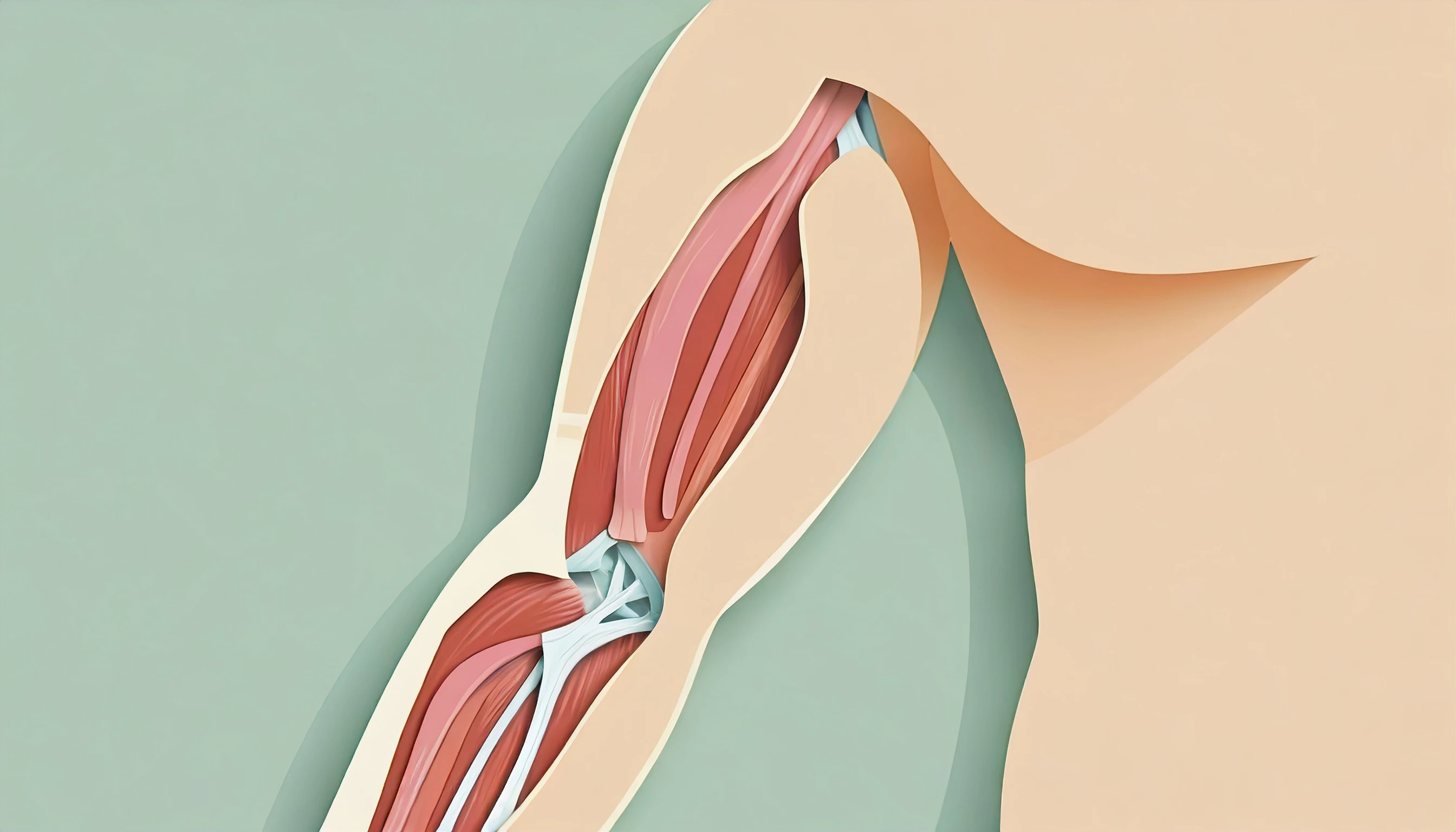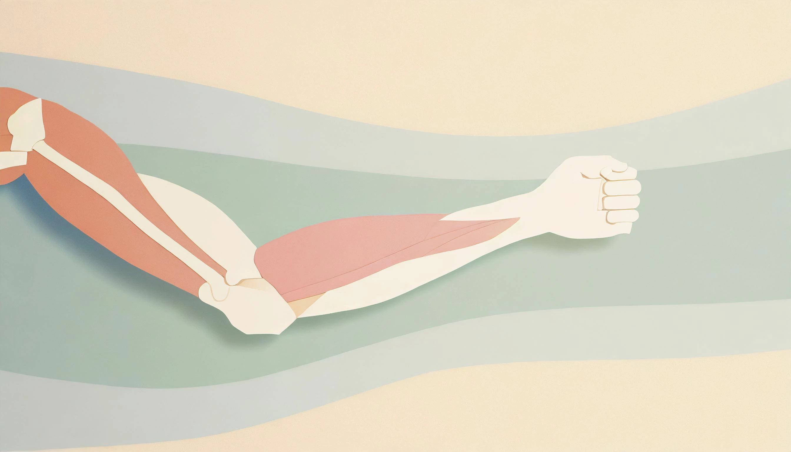 Prompt: Illustration of paper cutout Anatomy of the elbow muscles, plain background, simple colours, minimal, centred subject, focal point