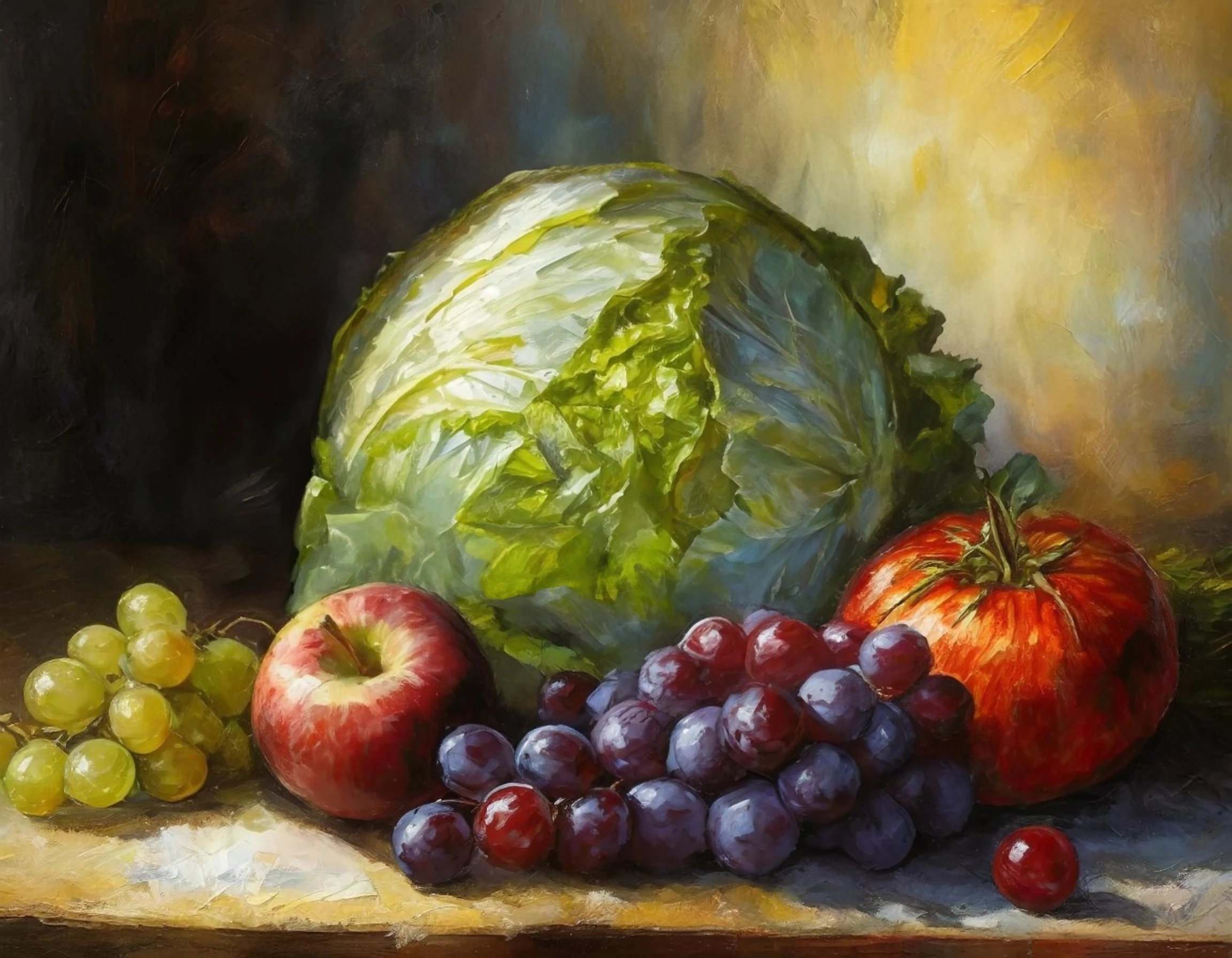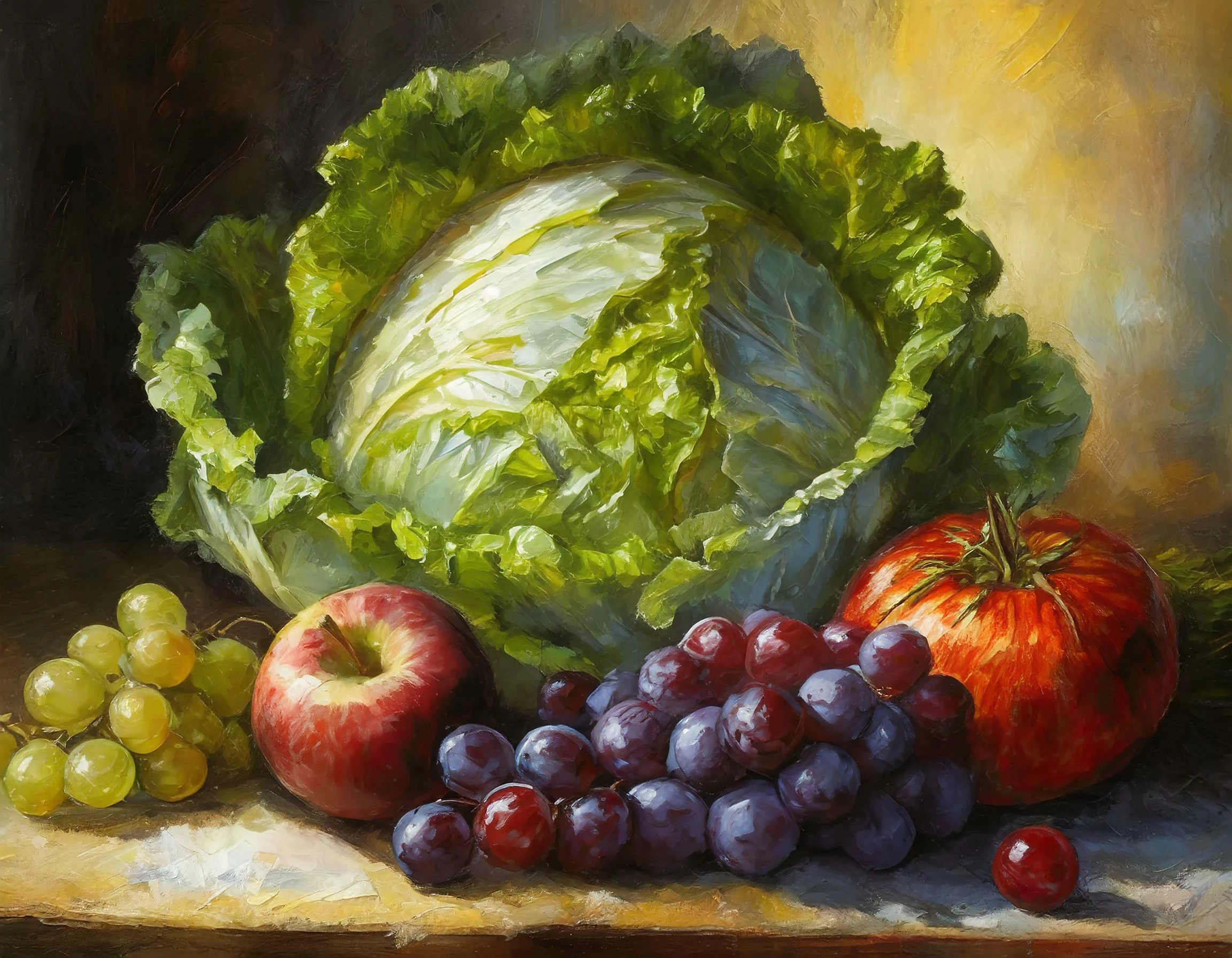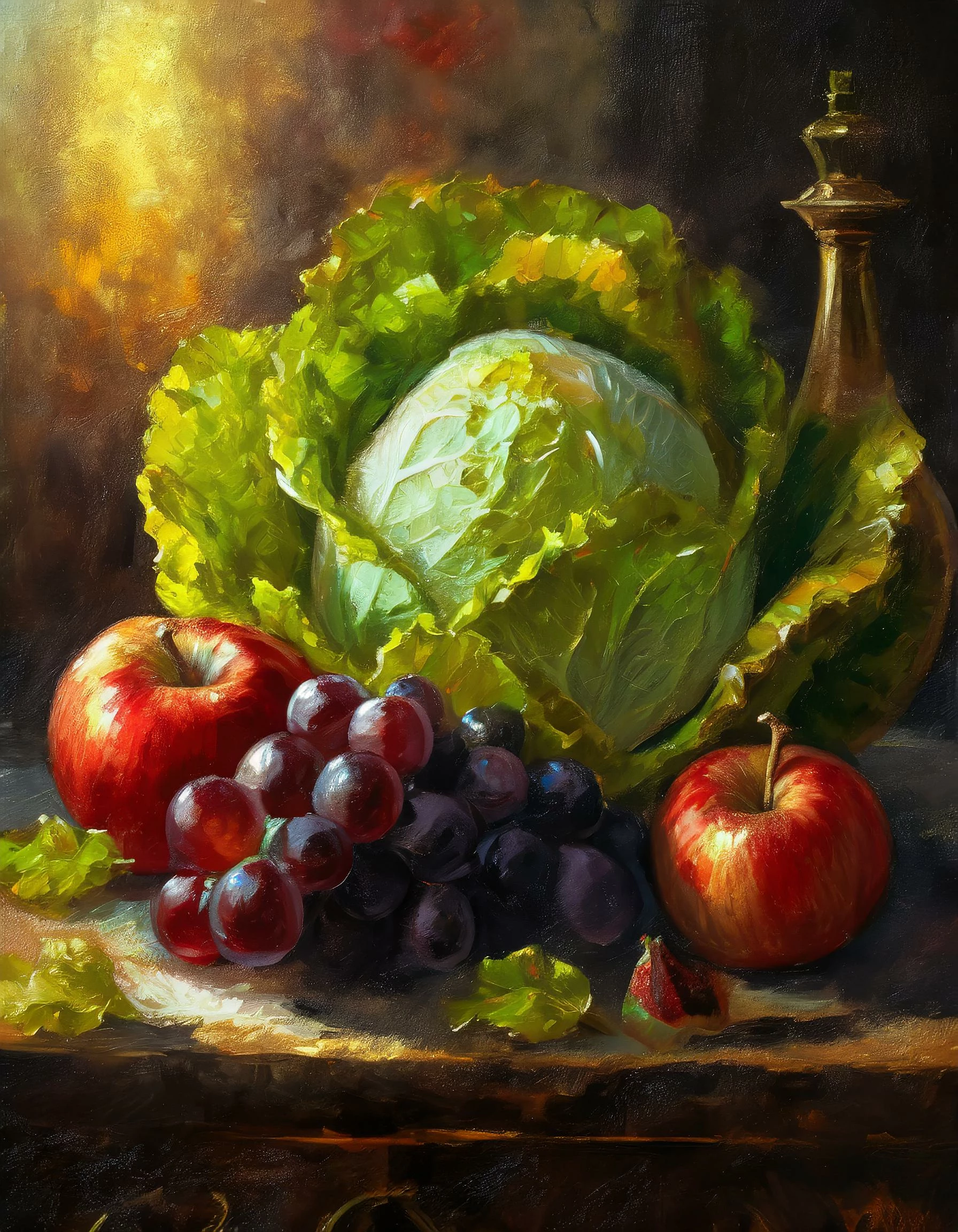I've been trying to produce an oil painting style/still life image of a lettuce, tomato, apple and grapes.