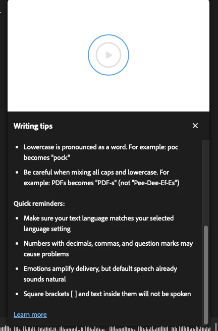Firefly is reading text inside square brackets even though the built in Tip guide says anything inside square brackets will not be spoken. I am due back 110 generative credits because of this.