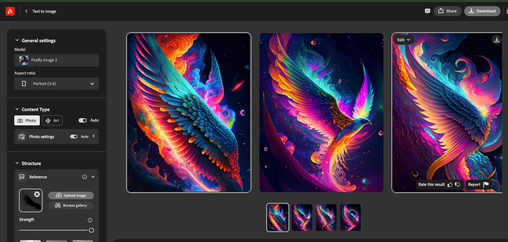 The preview size of the Firefly-generated images has unexpectedly increased to the extent that all four suggestions cannot be viewed simultaneously. Consequently, users are now required to scroll through the suggestions, leading to difficulties when attempting to scroll back, as it obstructs access to other features such as generative fill style options.