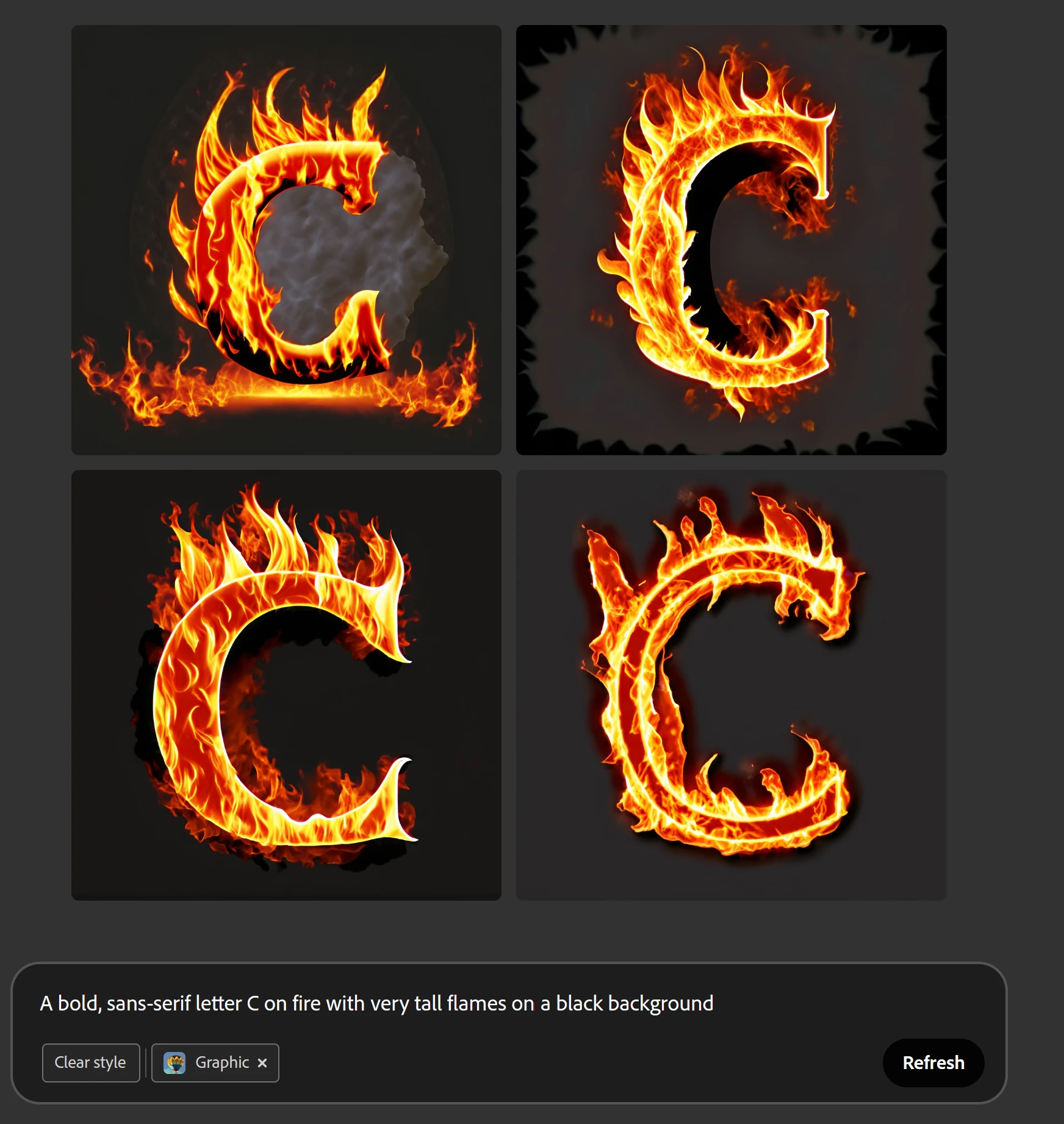 I used the prompt "A bold, sans-serif letter C on fire with very tall flames, on a black background", Generally it performed very well, however all the fonts used in the generation were serif, NOT sans-serif. Given Adobe's heritage I would expect it to respect any specified font instructions. Please see attached image
