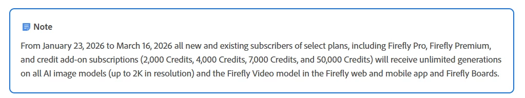 From January 23, 2026 to March 16, 2026 all new and existing subscribers of select plans, including Firefly Pro, Firefly Premium, and credit add-on subscriptions (2,000 Credits, 4,000 Credits, 7,000 Credits, and 50,000 Credits) will receive unlimited generations on all AI image models (up to 2K in resolution) and the Firefly Video model in the Firefly web and mobile app and Firefly Boards.