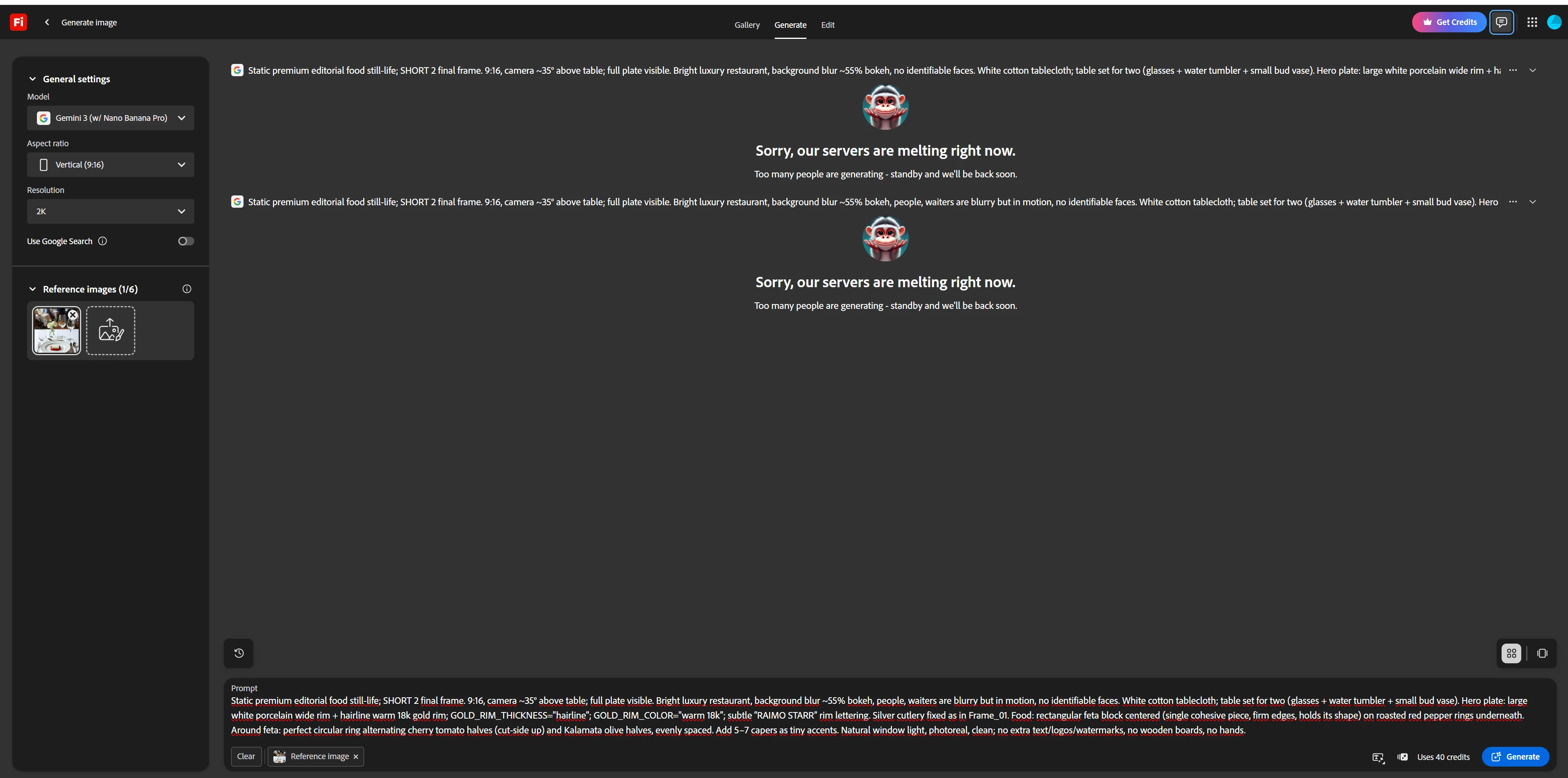 I open firefly, add my images, give it the prompt to generate, get the error: Something went wrong, please try again later. Over and over and over again. It doesn’t work. Going on two days now. Today it says: Sorry, our servers are melting right now.