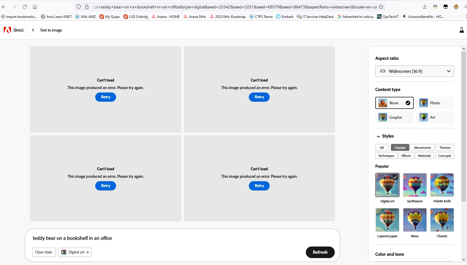 I'm only getting error messages "Can't load" this morning when I'm trying Firefly. This happens no matter which style(s) I choose and no matter what text I type in for the description.