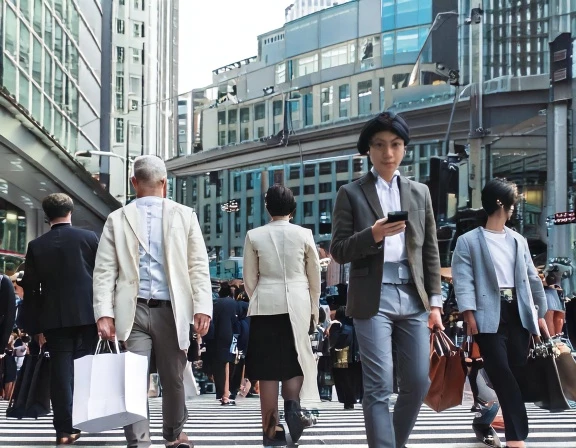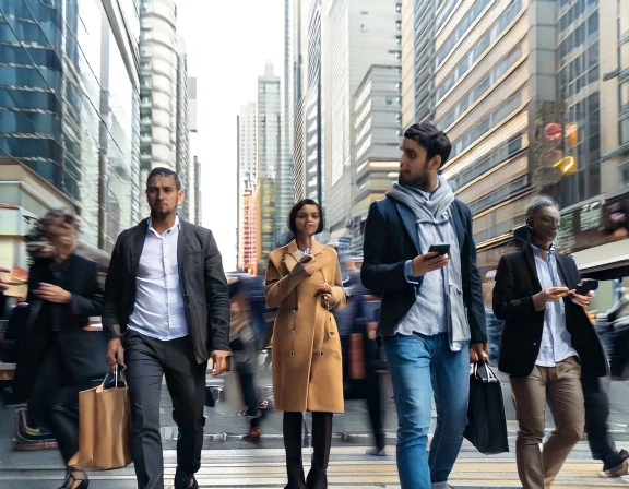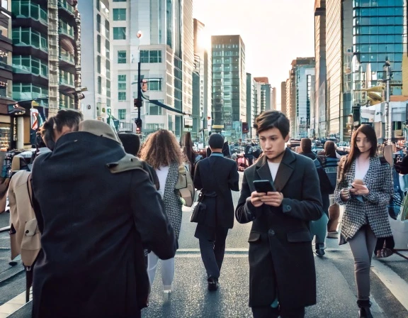 Elabora una imagen que muestre un grupo de personas caminando por la calle de una ciudad, absortos todos en sus teléfonos inteligentes. La imagen debe reflejar el bullicio y confusión de una ciudad a la hora de la comida, en una escenario semejante al cruce de Shibuya, de Tokio. Las personas deben ser de todas las edades y condiciones sociales. TOMA BIEN EN CUENTA ESTO: en una toma amplia, desde un segundo piso, donde pueda apreciarse el ajetreo propio de las grandes ciudades.