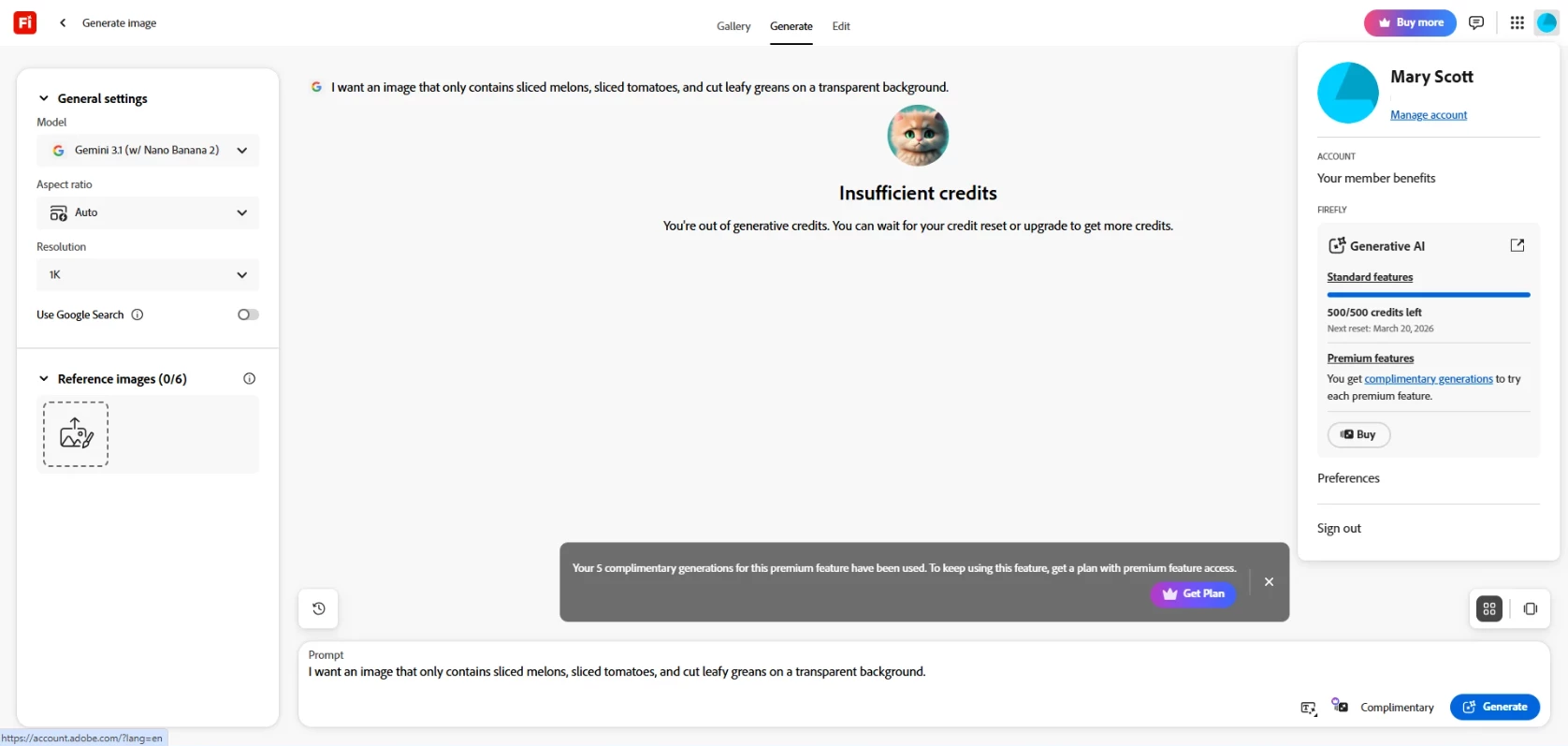 I am told that I have insufficient credits, but my profile says I have 500/500 remaining generative credits.