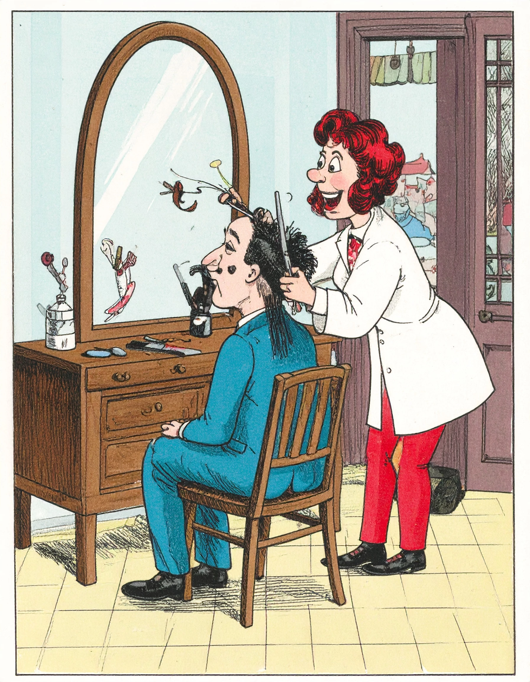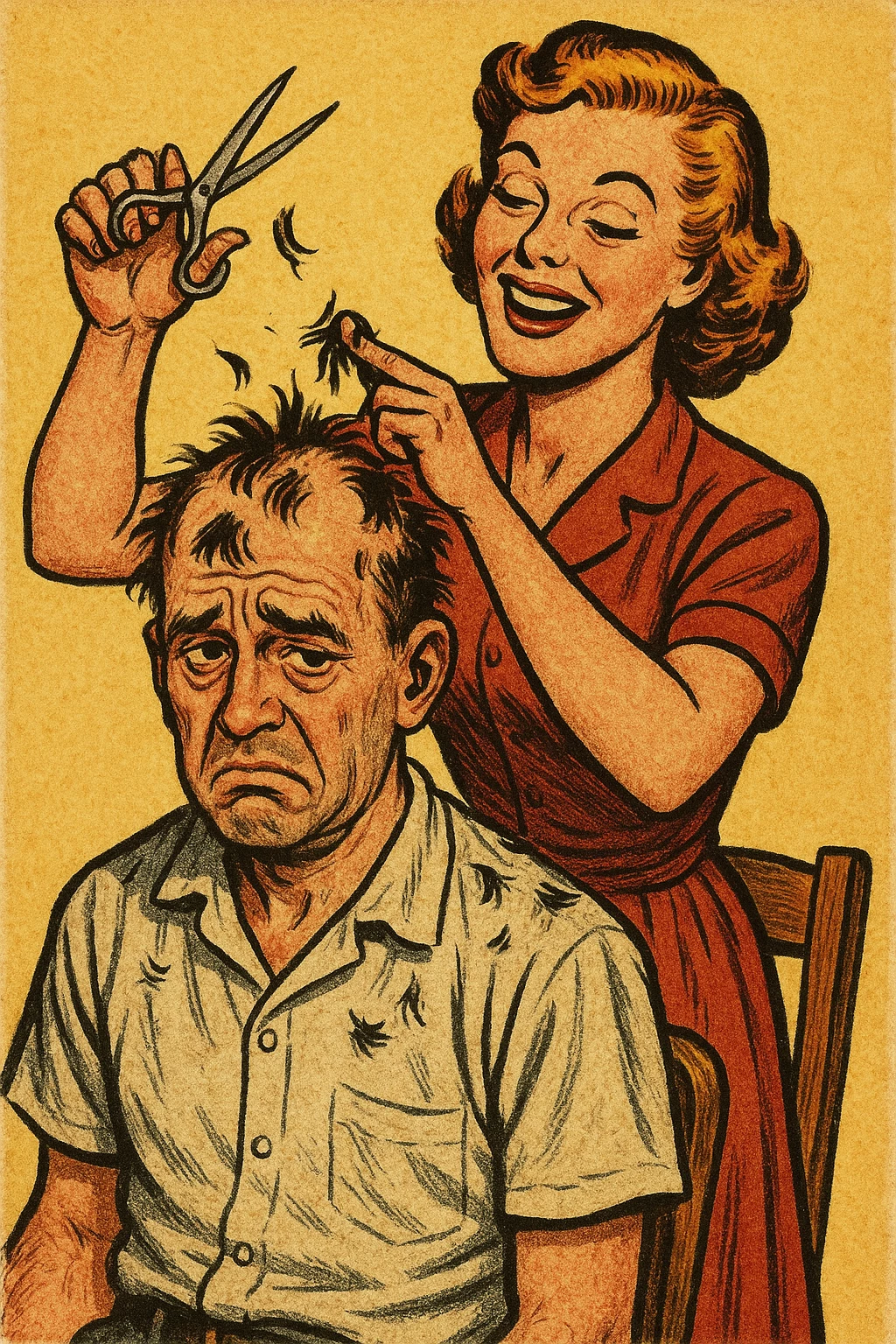 "can I have a vintage, pulp comic style illustration of a woman cutting her husband's hair.