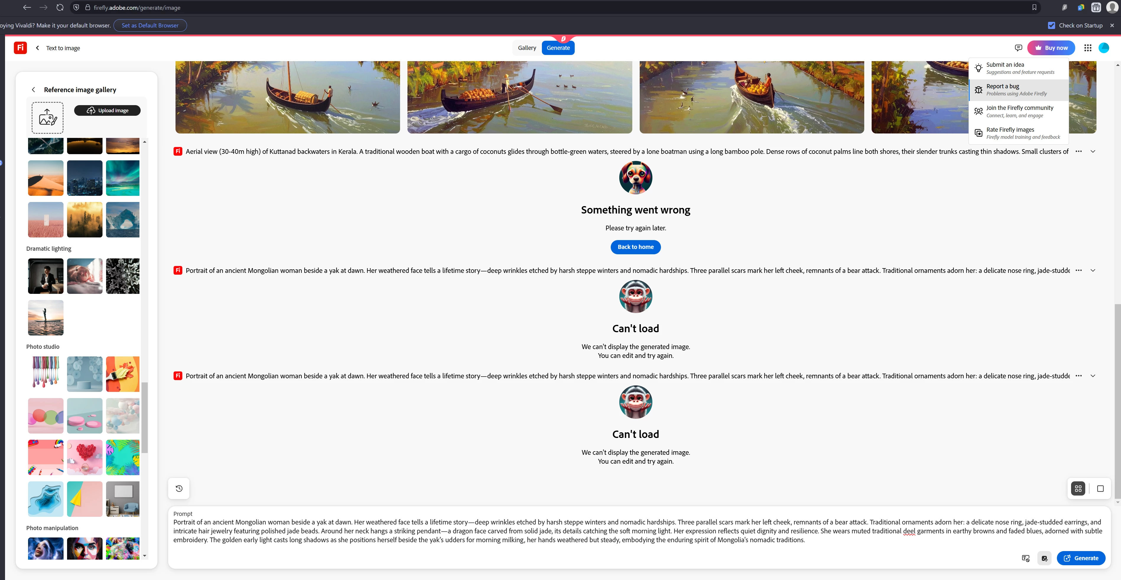 Are you still having this problem? I tried your prompt, and it generated for me. What it generated is not likely to match what you wanted, though, because your prompt is written in a "story-telling" way, rather than descriptive. The most important object should be as far left as possible and everything related to that object should be grouped together. I recommend this document: Writing effective prompts to further help you in crafting good prompts.