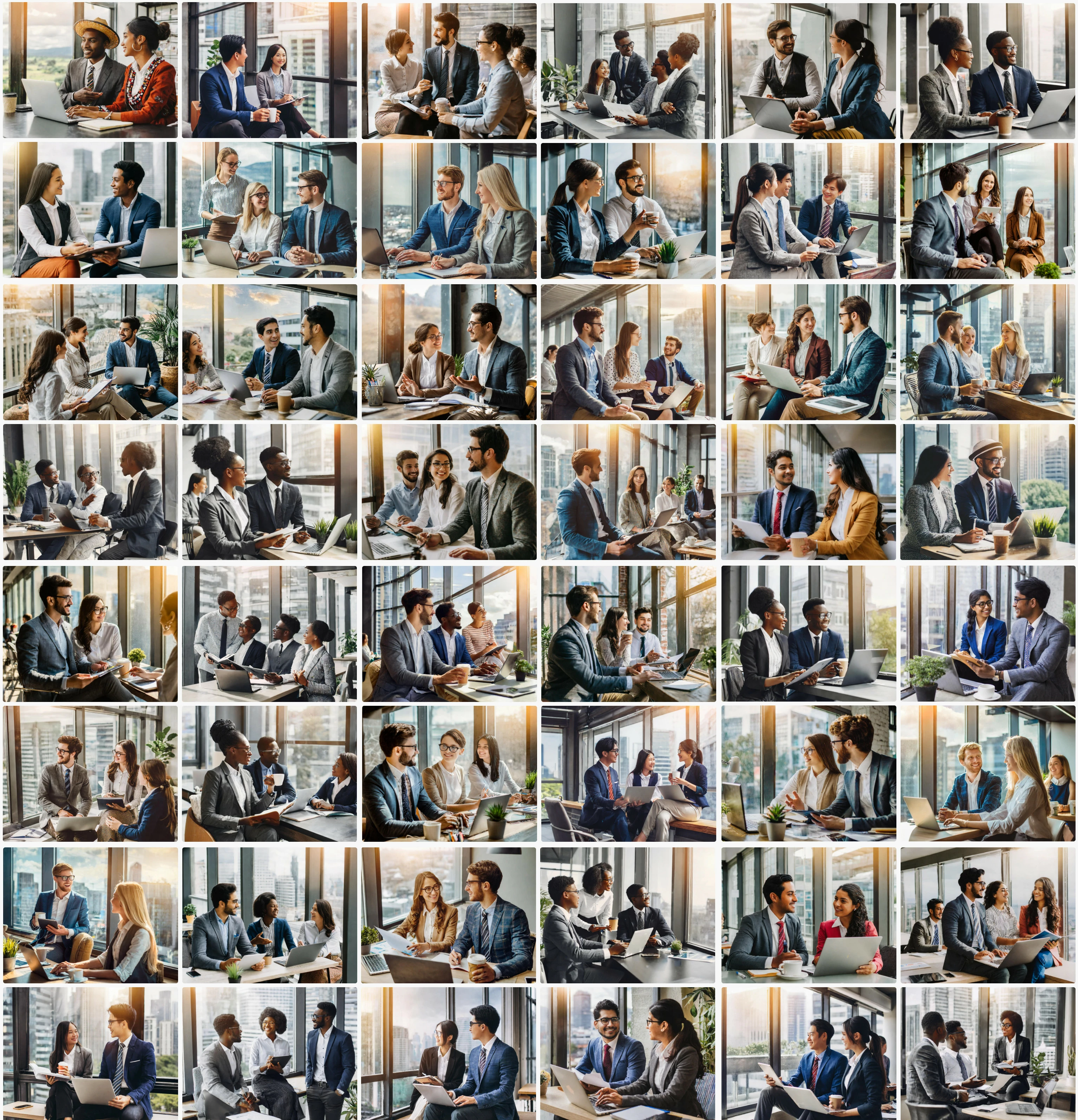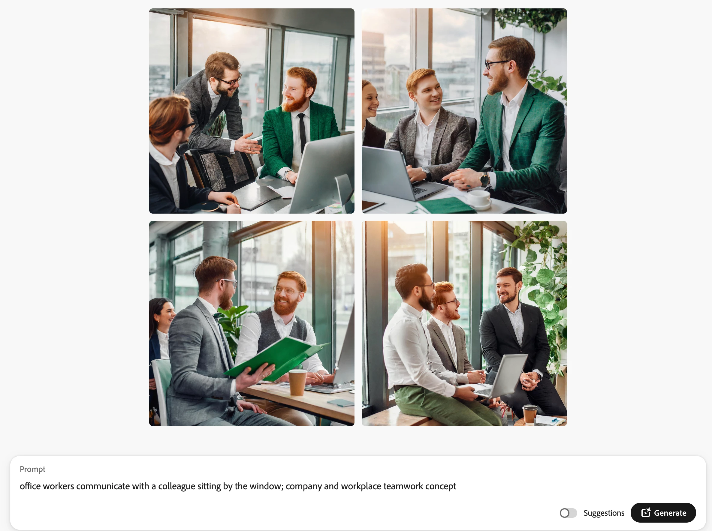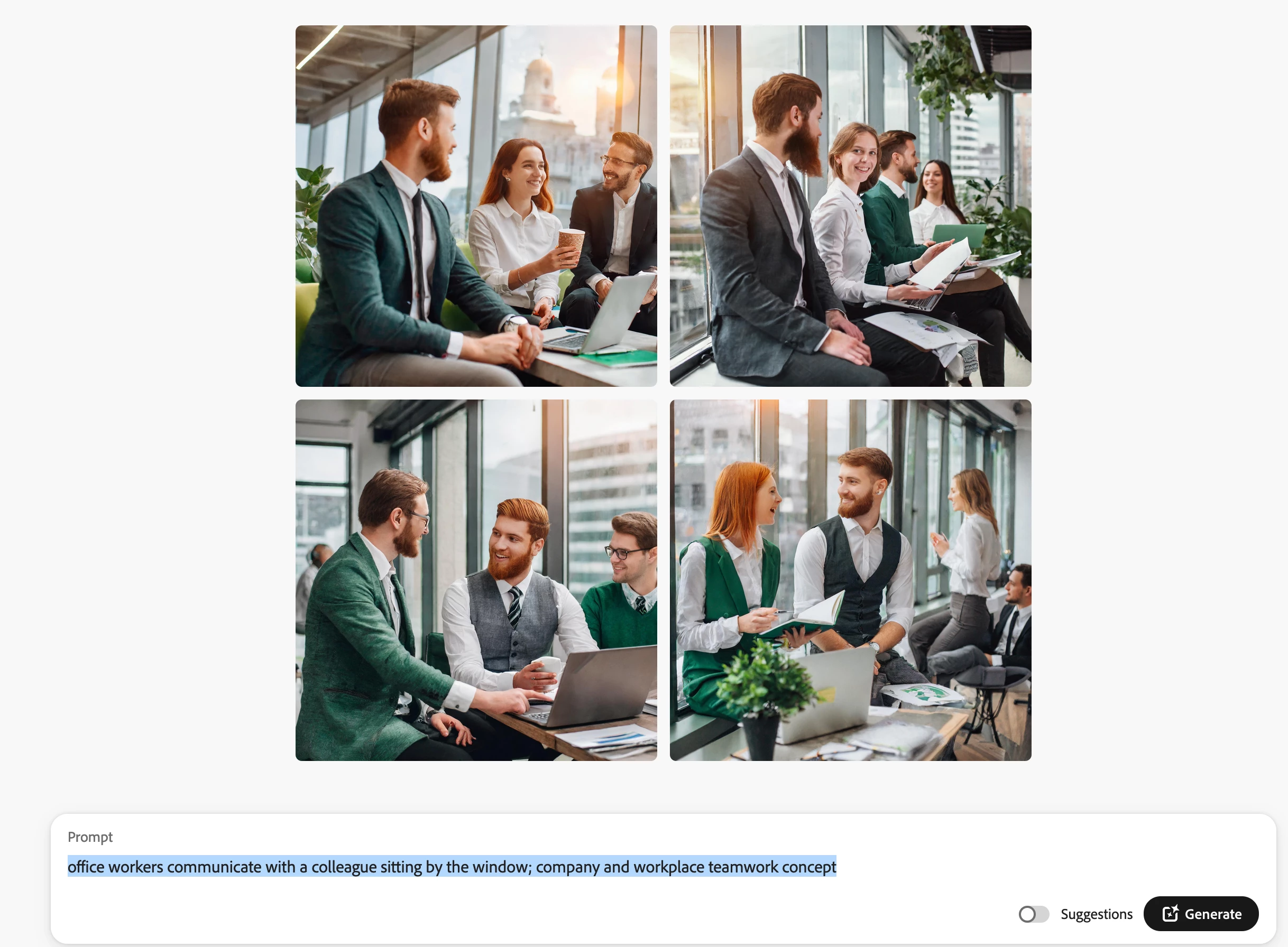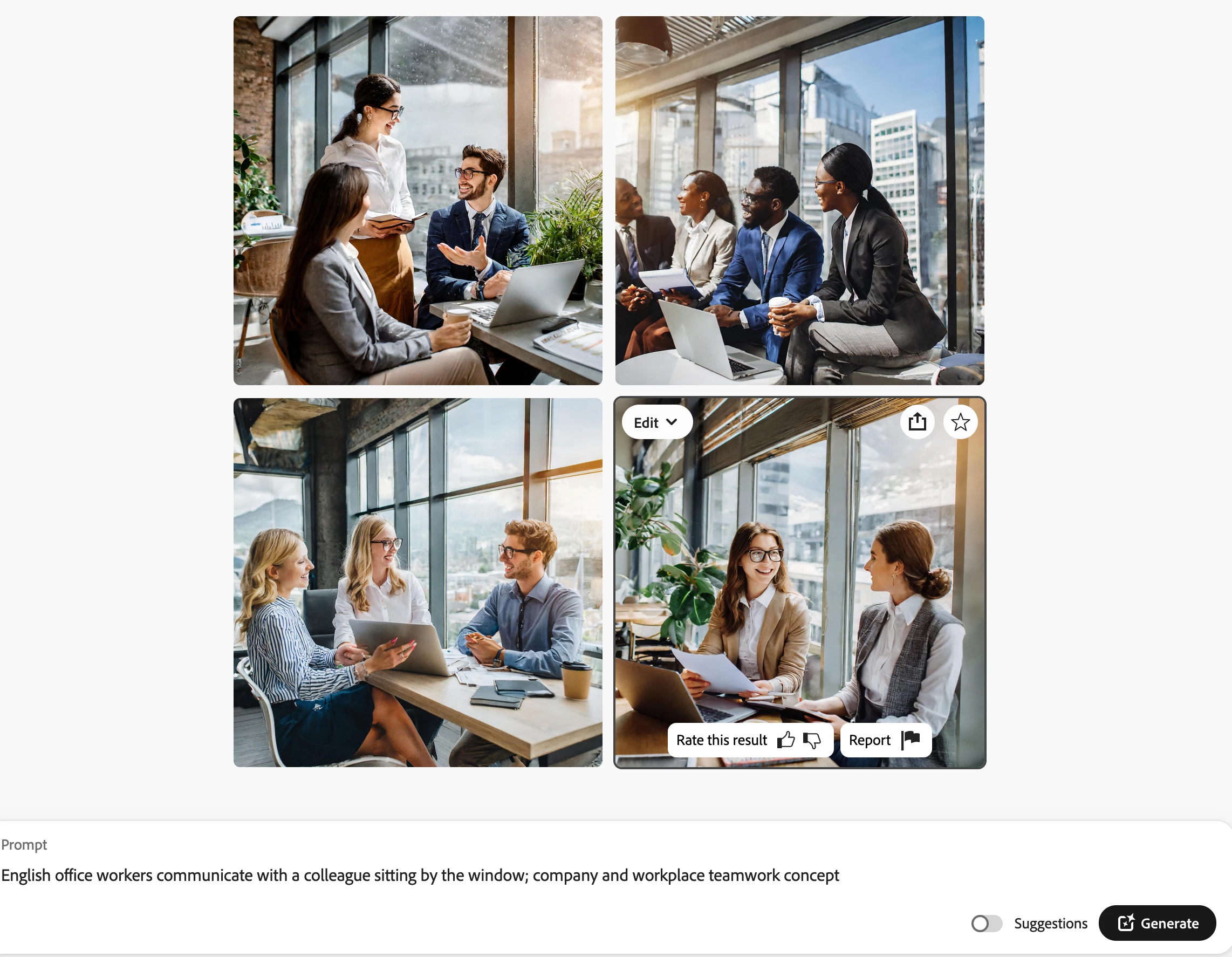 Changing promt to " English office workers communicate with a colleague sitting by the window; company and workplace teamwork concept" produces a more normal groupe of office workers.