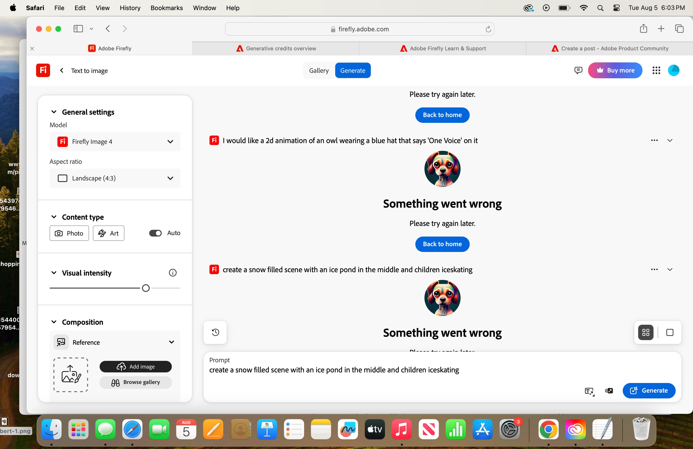 I keep putting prompts in to generate an image with Adobe Firefly, and it is giving the message "Something went wrong, please try again later". I have tried different prompts. I don't understand what went wrong, and I have tried several times. Another frustrating part is that each time I have tried, I am getting charged a generative credit, yet I nothing is being generated. Is this a bug?