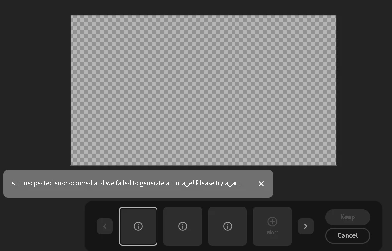 Every time I attempt to expand a photo using the Generative Fill feature, I encounter the following error message: "An unexpected error occurred and we failed to generate an image! Please try again." This issue persists regardless of the browser I use, as I have tried both Google Chrome and Microsoft Edge. Additionally, I have attempted to use different images, but the problem remains.