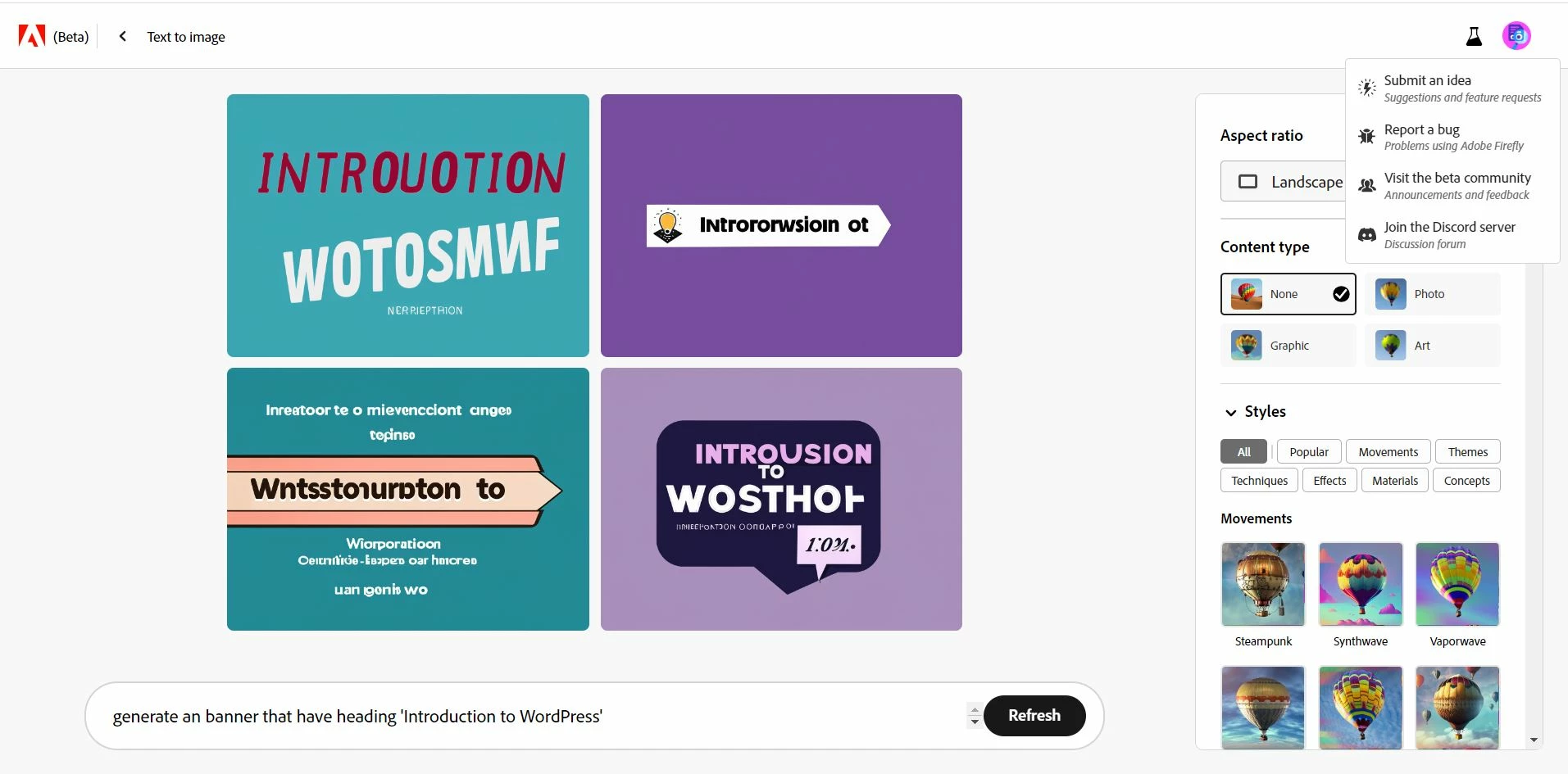 "We encountered a bug with Adobe Firefly where it failed to comprehend the language we provided to generate an image. Despite requesting a banner with the heading 'Introduction to WordPress,' the resulting image was incomprehensible. We're working on resolving this issue to ensure accurate image generation."