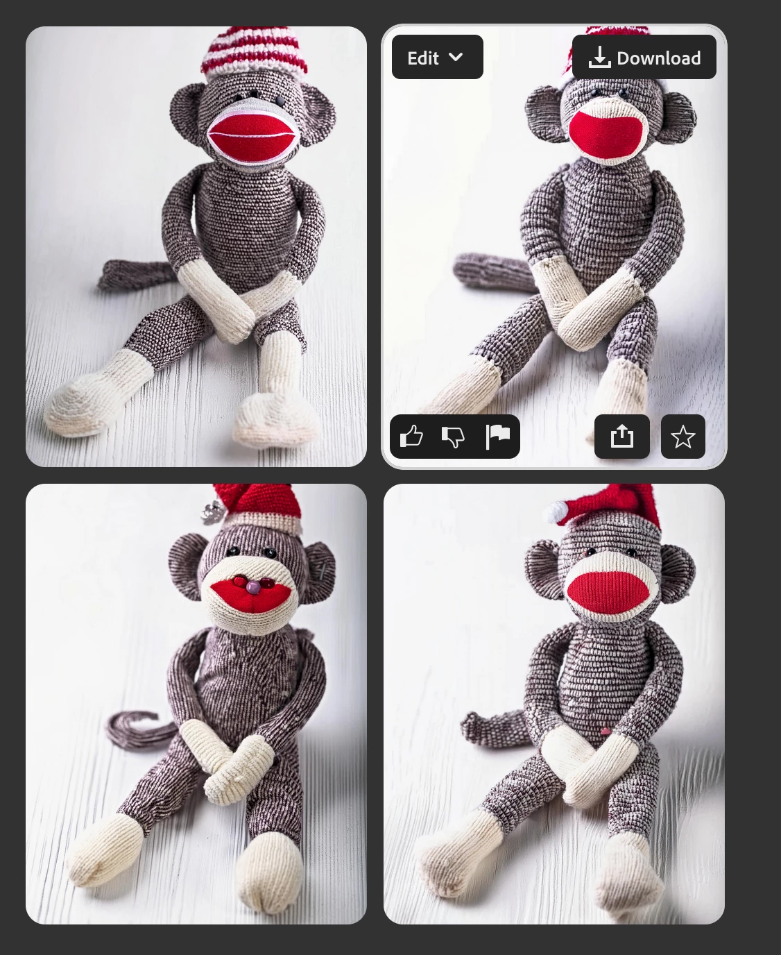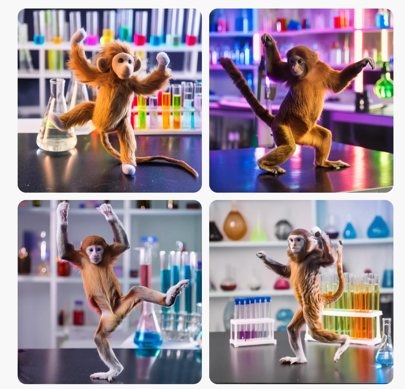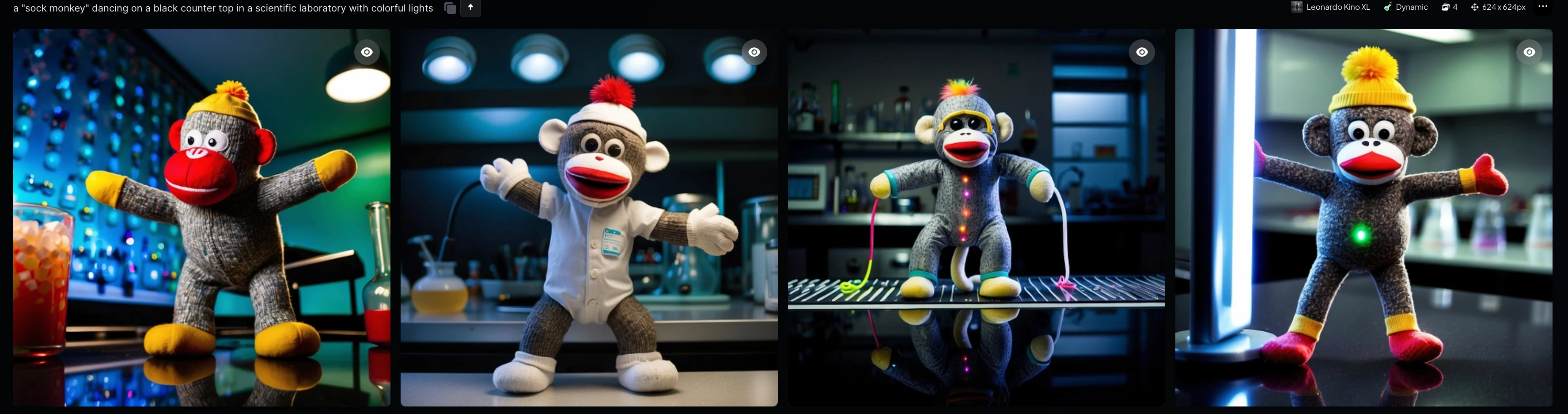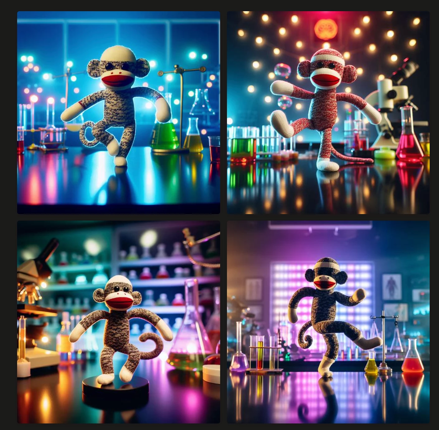 I have tried other AI models and Dalle-3 for instance has this figured out. Any way in the prompt. I could have gotten this to work? Here is what I used for both: a "sock monkey" dancing on a black counter top in a scientific laboratory with colorful lights.